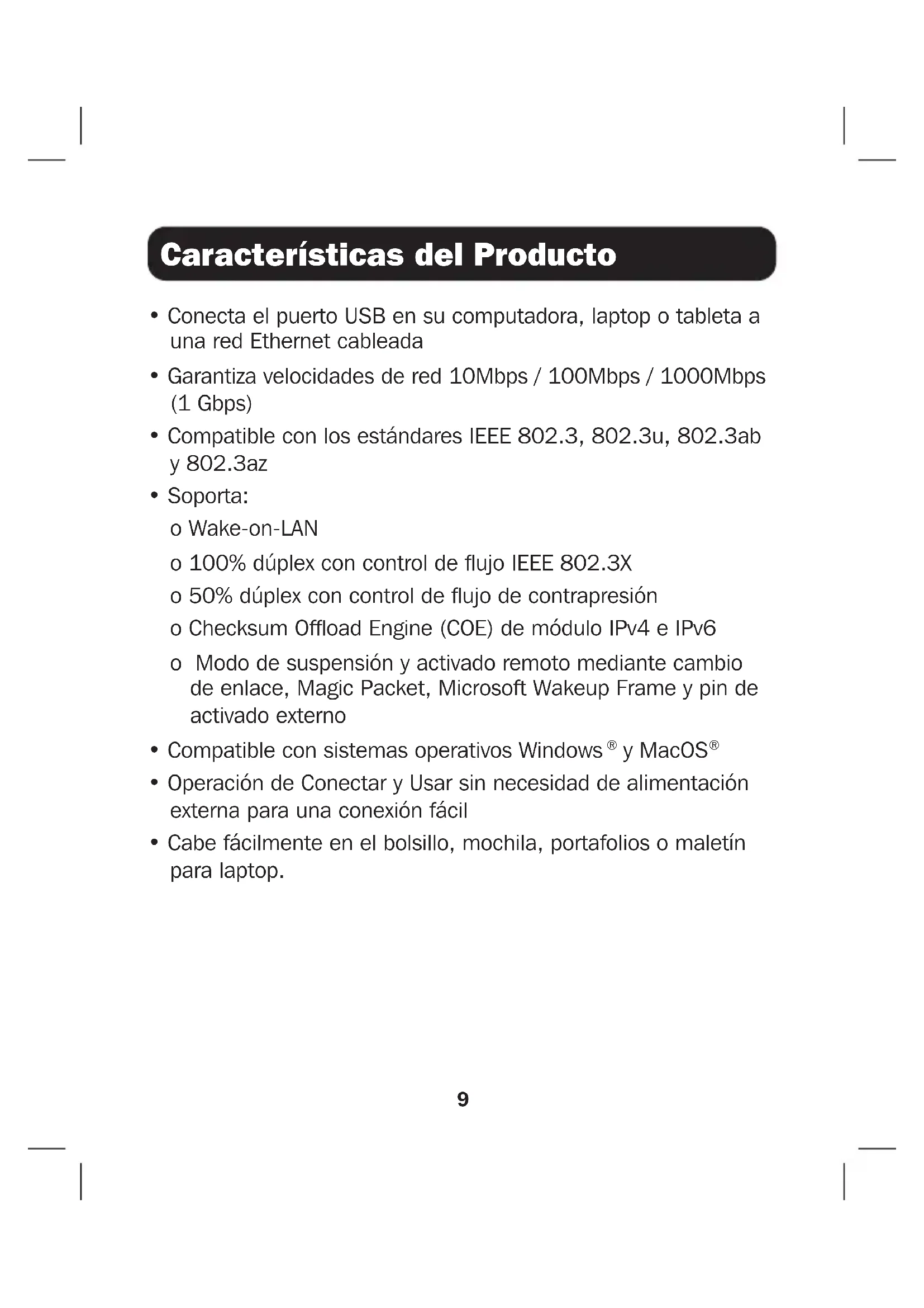 - Soporta: o Wake-on-LAN o 100% dúplex con control de flujo IEEE 802.3X o 50% dúplex con control de flujo de contrapresión o Checksum Offload Engine (COE) de módulo IPv4 e IPv6 o Modo de suspensión y activado remoto mediante cambio de enlace, Magic Packet, Microsoft Wakeup Frame y pin de activado externo