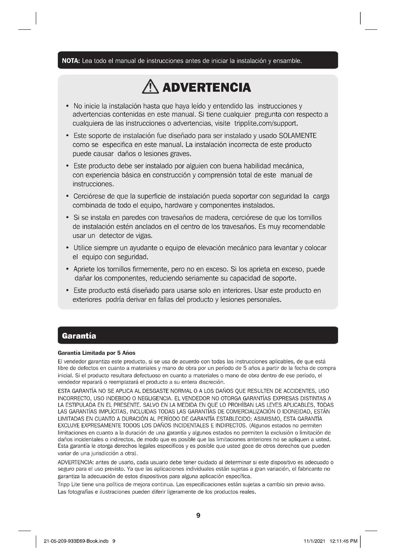 - Este producto está diseñado para usarse solo en interiores. Usar este producto en exteriores podría derivar en fallas del producto y lesiones personales. Garantía Limitada por 5 Años El vendedor garantiza este producto, si se usa de acuerdo con todas las instrucciones aplicables, de que está libre de defectos en cuanto a materiales y mano de obra por un período de 5 años a partir de la fecha de compra inicial. Si el producto resultara defectuoso en cuanto a materiales o mano de obra dentro de ese período, el vendedor reparará o reemplazará el producto a su entera discreción. ESTA GARANTÍA NO SE APLICA AL DESGASTE NORMAL O A LOS DAÑOS QUE RESULTEN DE ACCIDENTES, USO INCORRECTO, USO INDEBIDO O NEGLIGENCIA. EL VENDEDOR NO OTORGA GARANTÍAS EXPRESAS DISTINTAS A LA ESTIPULADA EN EL PRESENTE. SALVO EN LA MEDIDA EN QUE LO PROHÍBAN LAS LEYES APLICABLES, TODAS LAS GARANTÍAS IMPLÍCITAS, INCLUIDAS TODAS LAS GARANTÍAS DE COMERCIALIZACIÓN O IDONEIDAD, ESTÁN LIMITADAS EN CUANTO A DURACIÓN AL PERÍODO DE GARANTÍA ESTABLECIDO; ASIMISMO, ESTA GARANTÍA EXCLUYE EXPRESAMENTE TODOS LOS DAÑOS INCIDENTALES E INDIRECTOS. (Algunos estados no permiten limitaciones en cuanto a la duración de una garantía y algunos estados no permiten la exclusión o limitación de daños incidentales o indirectos, de modo que es posible que las limitaciones anteriores no se apliquen a usted. Esta garantía le otorga derechos legales específicos y es posible que usted goce de otros derechos que pueden variar de una jurisdicción a otra). ADVERTENCIA: antes de usarlo, cada usuario debe tener cuidado al determinar si este dispositivo es adecuado o seguro para el uso previsto. Ya que las aplicaciones individuales están sujetas a gran variación, el fabricante no garantiza la adecuación de estos dispositivos para alguna aplicación específica. Tripp Lite tiene una política de mejora continua. Las especificaciones están sujetas a cambio sin previo aviso. Las fotografías e ilustraciones pueden diferir ligeramente de los productos reales. 21-05-209-933E69-Book.indb 921-05-209-933E69-Book.indb 9 11/1/2021 12:11:45 PM11/1/2021 12:11:45 PM10 IMPORTANTE: Asegúrese de haber recibido todas las partes de acuerdo a la lista de comprobación de componentes antes de instalar. Si faltase alguna parte o estuviese dañada, visite tripplite.com/support para solicitar servicio. Accesorios y Partes Incluidas en el Empaque A (x2) F (x3) B (x2) C (x1) D (x1) M5x10 (x4) Tornillo de Anclaje (x4) Ancla para Concreto (x4) Arandela D6 (x4) Paquete M Paquete W M5x14 (x4) M8x45 (x4) M6x14 (x4) Arandela (x4) M6x25 (4) Espaciador Pequeño (x4) M8x25 (x4) Espaciador Grande (x4) 21-05-209-933E69-Book.indb 1021-05-209-933E69-Book.indb 10 11/1/2021 12:11:45 PM11/1/2021 12:11:45 PM11