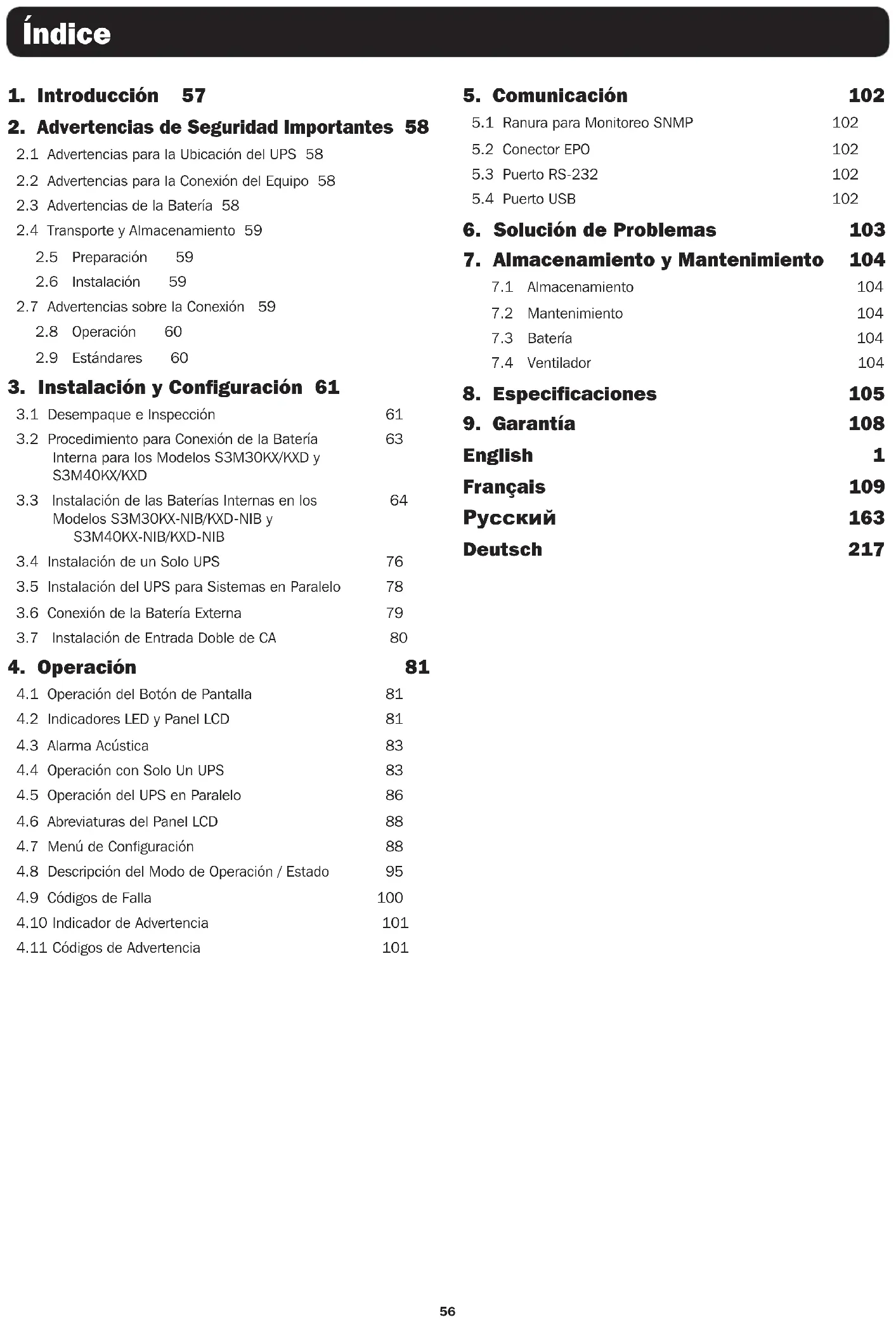 - El reemplazo de la batería debe realizarlo únicamente el personal de servicio autorizado usando el mismo número y tipo de baterías (Plomo-Ácido Selladas). ADVERTENCIA: A fin de evitar cualquier condición riesgosa durante la instalación y mantenimiento del UPS, estas tareas pueden ejecutarse solamente por personal calificado y electricistas expertos. Antes de instalar o usar la unidad, lea cuidadosamente este Manual del Propietario y las instrucciones de seguridad.59