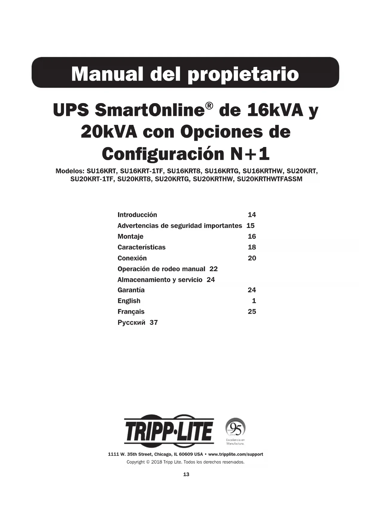 de 16kVA y 20kVA con Opciones de Configuración N+1 Modelos: SU16KRT, SU16KRT-1TF, SU16KRT8, SU16KRTG, SU16KRTHW, SU20KRT, SU20KRT-1TF, SU20KRT8, SU20KRTG, SU20KRTHW, SU20KRTHWTFASSM Introducción 14 Advertencias de seguridad importantes 15 Montaje 16 Características 18 Conexión 20 Operación de rodeo manual 22 Almacenamiento y servicio 24 Garantía 24 English 1 Français 25 Русский 37 1111 W. 35th Street, Chicago, IL 60609 USA • www.tripplite.com/supportCopyright © 2018 Tripp Lite. Todos los derechos reservados.14 Introducción Su sistema UPS de 16kVA o 20kVA de Tripp Lite incluye dos módulos de potencia de 8Kva o 10kVA, junto con un PDU en paralelo y un cable de comunicaciones que combina la salida de los dos módulos de potencia del UPS para alimentar directamente su equipo. Su UPS soporta automáticamente tolerancia a fallas N+1 a niveles de carga hasta un 50% y operación no redundante a cargas superiores al 50%. El PDU en paralelo incluido con switch de derivación permite también el reemplazo Hot-Swap de uno o ambos módulos de potencia sin tiempo muerto. Para asistencia adicional de la configuración, póngase en contacto con Tripp Lite. Configuración redundante de 10 kVA (10 kVA de carga máxima) Configuración sin redundancia de 20 kVA (20 kVA de carga máxima) Cuando dos sistemas UPS tienen una carga máxima del 50%, su configuración recibirá una redundancia completa y una tolerancia a fallos con soporte completo para la reposición del UPS de sustitución en caliente en caso de fallo repentino del UPS. Cuando dos sistemas UPS tienen la carga máxima del 100%, su configuración recibirá la capacidad completa de ambos sistemas UPS combinados para suministrar potencia a las cargas mayores. Esta configuración NO tiene opciones de redundancia o tolerancia a fallas. Es posible el reemplazo Hot-Swap del UPS en funcionamiento (Hot swap) si coloca el PDU en modo de derivación (Consulte la Sección de “Operación Manual de Derivación”). Para garantizar la tolerancia a fallos, cargue los dos sistemas UPS paralelos con un máximo del 50% de la potencia de servicio combinada para ambos sistemas UPS. Por ejemplo, si tiene dos sistemas UPS de 10 kVA, contará con un funcionamiento tolerante a fallos si el nivel de carga se mantiene en 10 kVA o menos. Puede utilizar esta configuración para ampliar la capacidad de potencia de su UPS a 16 kVA (cuando se utilizan dos sistemas UPS de 8 kVA) o a 20 kVA (cuando se utilizan dos sistemas UPS de 10 kVA). En esta configuración NO está disponible la opción de tolerancia a fallos. Para Configuraciones de UPS de 16kVA o 20KVA
