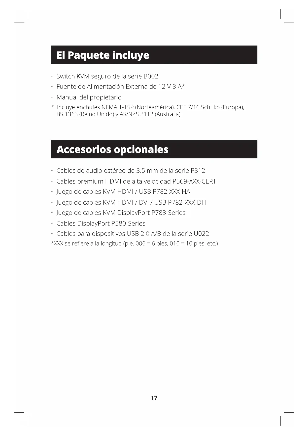 - Cables para dispositivos USB 2.0 A/B de la serie U022 *XXX se reere a la longitud (p.e. 006 = 6 pies, 010 = 10 pies, etc.) El Paquete incluye Accesorios opcionales18