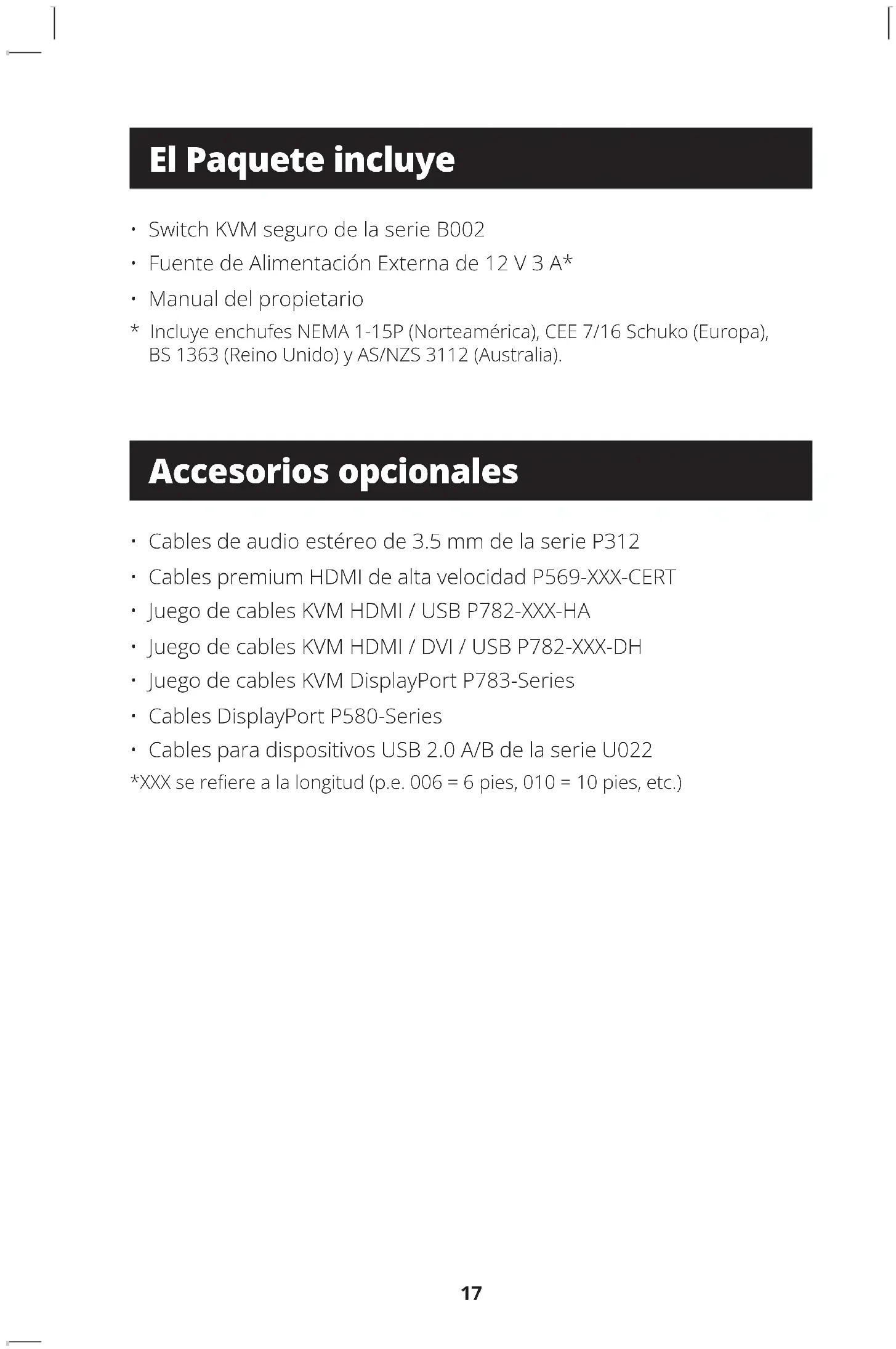 - Cables para dispositivos USB 2.0 A/B de la serie U022 *XXX se reere a la longitud (p.e. 006 = 6 pies, 010 = 10 pies, etc.) El Paquete incluye Accesorios opcionales18
