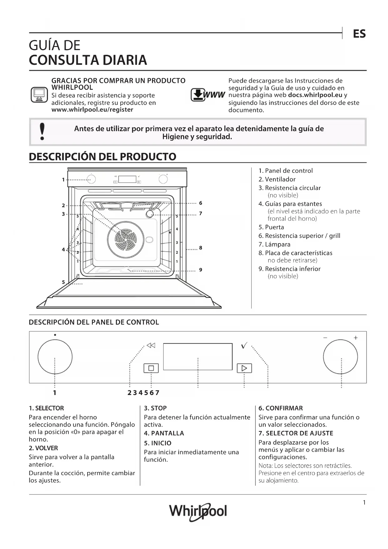 CONSULTA DIARIA GRACIAS POR COMPRAR UN PRODUCTO WHIRLPOOLSi desea recibir asistencia y soporte adicionales, registre su producto en www . whirlpool . eu / register WWW Puede descargarse las Instrucciones de seguridad y la Guía de uso y cuidado en nuestra página web docs.whirlpool.eu y siguiendo las instrucciones del dorso de este documento. Antes de utilizar por primera vez el aparato lea detenidamente la guía de Higiene y seguridad.