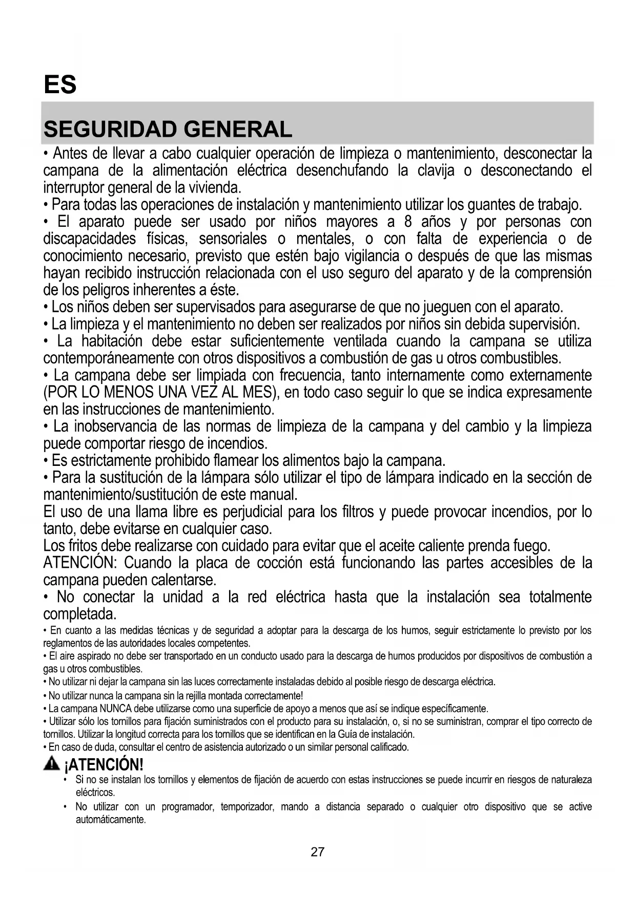 - La habitación debe estar suficientemente ventilada cuando la campana se utiliza contemporáneamente con otros dispositivos a combustión de gas u otros combustibles.