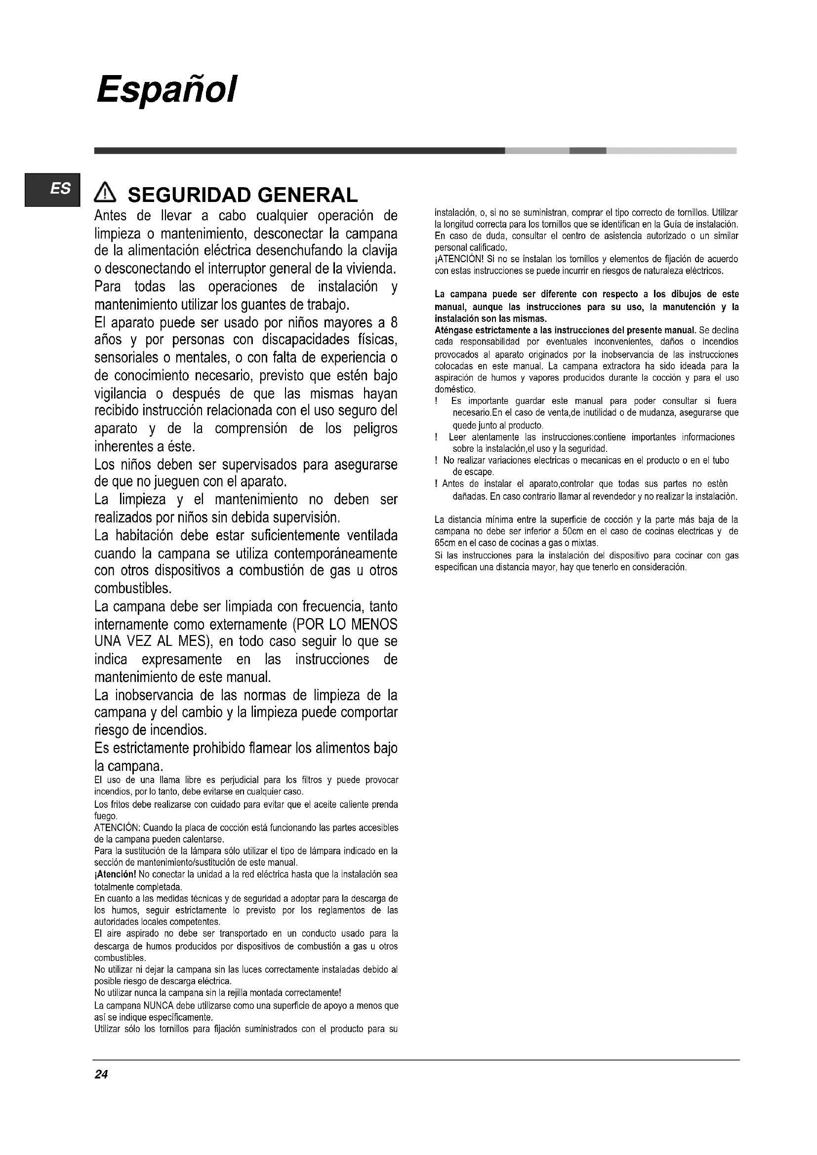 SEGURIDAD GENERAL Antes de llevar a cabo cualquier operación de limpieza o mantenimiento, desconectar la campana de la alimentación eléctrica desenchufando la clavija o desconectando el interruptor general de la vivienda. Para todas las operaciones de instalación y mantenimiento utilizar los guantes de trabajo. El aparato puede ser usado por niños mayores a 8 años y por personas con discapacidades físicas, sensoriales o mentales, o con falta de experiencia o de conocimiento necesario, previsto que estén bajo vigilancia o después de que las mismas hayan recibido instrucción relacionada con el uso seguro del aparato y de la comprensión de los peligros inherentes a éste. Los niños deben ser supervisados para asegurarse de que no jueguen con el aparato. La limpieza y el mantenimiento no deben ser realizados por niños sin debida supervisión. La habitación debe estar suficientemente ventilada cuando la campana se utiliza contemporáneamente con otros dispositivos a combustión de gas u otros combustibles. La campana debe ser limpiada con frecuencia, tanto internamente como externamente (POR LO MENOS UNA VEZ AL MES), en todo caso seguir lo que se indica expresamente en las instrucciones de mantenimiento de este manual. La inobservancia de las normas de limpieza de la campana y del cambio y la limpieza puede comportar riesgo de incendios. Es estrictamente prohibido flamear los alimentos bajo la campana. El uso de una llama libre es perjudicial para los filtros y puede provocar incendios, por lo tanto, debe evitarse en cualquier caso. Los fritos debe realizarse con cuidado para evitar que el aceite caliente prenda fuego. ATENCIÓN: Cuando la placa de cocción está funcionando las partes accesibles de la campana pueden calentarse. Para la sustitución de la lámpara sólo utilizar el tipo de lámpara indicado en la sección de mantenimiento/sustitución de este manual. ¡Atención! No conectar la unidad a la red eléctrica hasta que la instalación sea totalmente completada. En cuanto a las medidas técnicas y de seguridad a adoptar para la descarga de los humos, seguir estrictamente lo previsto por los reglamentos de las autoridades locales competentes. El aire aspirado no debe ser transportado en un conducto usado para la descarga de humos producidos por dispositivos de combustión a gas u otros combustibles. No utilizar ni dejar la campana sin las luces correctamente instaladas debido al posible riesgo de descarga eléctrica. No utilizar nunca la campana sin la rejilla montada correctamente! La campana NUNCA debe utilizarse como una superficie de apoyo a menos que así se indique específicamente. Utilizar sólo los tornillos para fijación suministrados con el producto para su instalación, o, si no se suministran, comprar el tipo correcto de tornillos. Utilizar la longitud correcta para los tornillos que se identifican en la Guía de instalación. En caso de duda, consultar el centro de asistencia autorizado o un similar personal calificado. ¡ATENCIÓN! Si no se instalan los tornillos y elementos de fijación de acuerdo con estas instrucciones se puede incurrir en riesgos de naturaleza eléctricos. La campana puede ser diferente con respecto a los dibujos de este manual, aunque las instrucciones para su uso, la manutención y la instalación son las mismas. Aténgase estrictamente a las instrucciones del presente manual. Se declina cada responsabilidad por eventuales inconvenientes, daños o incendios provocados al aparato originados por la inobservancia de las instrucciones colocadas en este manual. La campana extractora ha sido ideada para la aspiración de humos y vapores producidos durante la cocción y para el uso doméstico. ! Es importante guardar este manual para poder consultar si fuera necesario.En el caso de venta,de inutilidad o de mudanza, asegurarse que quede junto al producto. ! Leer atentamente las instrucciones:contiene importantes informaciones sobre la instalación,el uso y la seguridad. ! No realizar variaciones electricas o mecanicas en el producto o en el tubo de escape. ! Antes de instalar el aparato,controlar que todas sus partes no estèn dañadas. En caso contrario llamar al revendedor y no realizar la instalaciòn. La distancia mínima entre la superficie de cocción y la parte más baja de la campana no debe ser inferior a 50cm en el caso de cocinas electricas y de 65cm en el caso de cocinas a gas o mixtas. Si las instrucciones para la instalación del dispositivo para cocinar con gas especifican una distancia mayor, hay que tenerlo en consideración.25