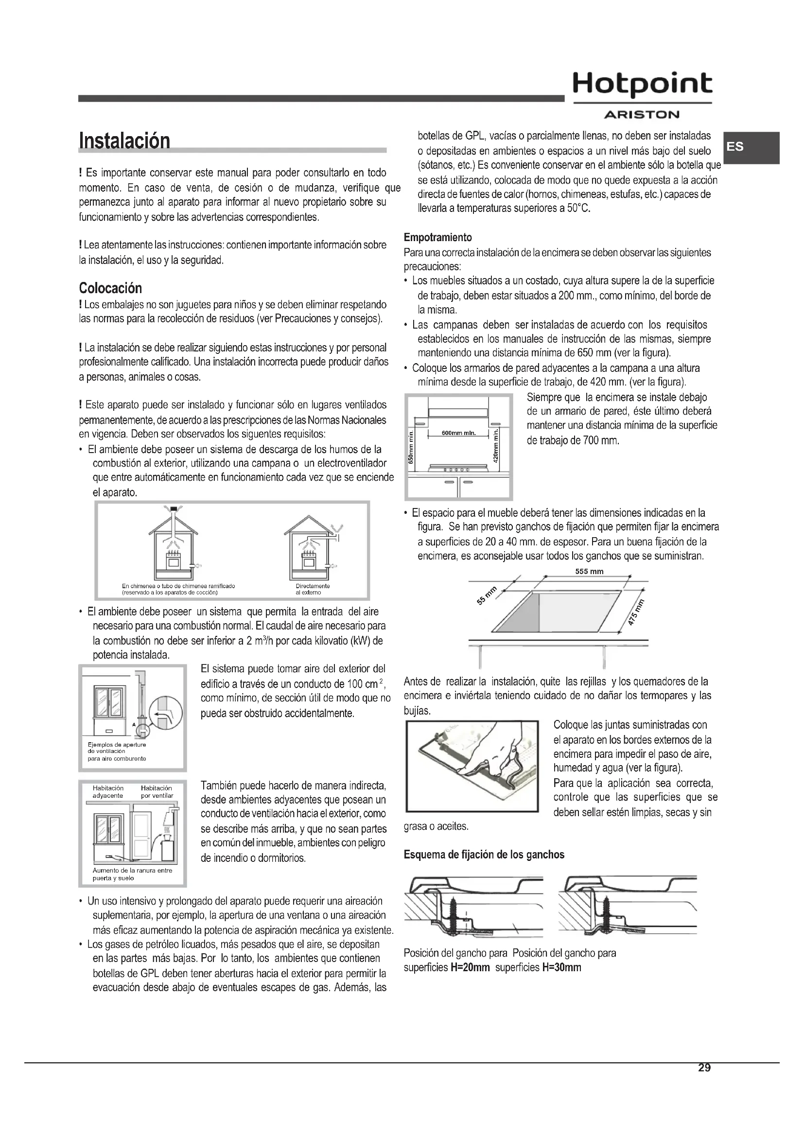 - El espacio para el mueble deberá tener las dimensiones indicadas en la gura. Se han previsto ganchos de jación que permiten jar la encimera a supercies de 20 a 40 mm. de espesor. Para un buena jación de la encimera, es aconsejable usar todos los ganchos que se suministran. 555 mm 55 mm 475 mm Antes de realizar la instalación, quite las rejillas y los quemadores de la encimera e inviértala teniendo cuidado de no dañar los termopares y las bujías. Coloque las juntas suministradas con el aparato en los bordes externos de la encimera para impedir el paso de aire, humedad y agua (ver la gura). Para que la aplicación sea correcta, controle que las superficies que se deben sellar estén limpias, secas y sin grasa o aceites. Esquema de jación de los ganchos Posición del gancho para Posición del gancho para supercies H=20mm supercies H=30mm 600mm min. 420mm min. 650mm min.30