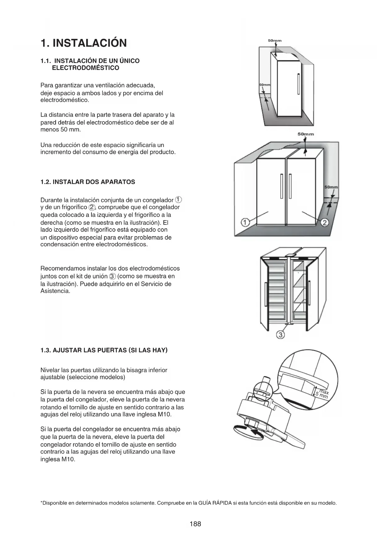 (comosemuestraen lailustración).PuedeadquirirloenelServiciode Asistencia. 1.3. AJUSTAR LAS PUERTAS (SI LAS HAY) Nivelar las puertas utilizando la bisagra inferior ajustable(seleccionemodelos) Si la puerta de la nevera se encuentra más abajo que lapuertadelcongelador,elevelapuertadelanevera rotando el tornillo de ajuste en sentido contrario a las agujasdelrelojutilizandounallaveinglesaM10. Si la puerta del congelador se encuentra más abajo quelapuertadelanevera,elevelapuertadel congelador rotando el tornillo de ajuste en sentido contrario a las agujas del reloj utilizando una llave inglesaM10. *Disponibleendeterminadosmodelossolamente.CompruebeenlaGUÍARÁPIDAsiestafunciónestádisponibleensumodelo. 50mm 50mm 5 mm max189