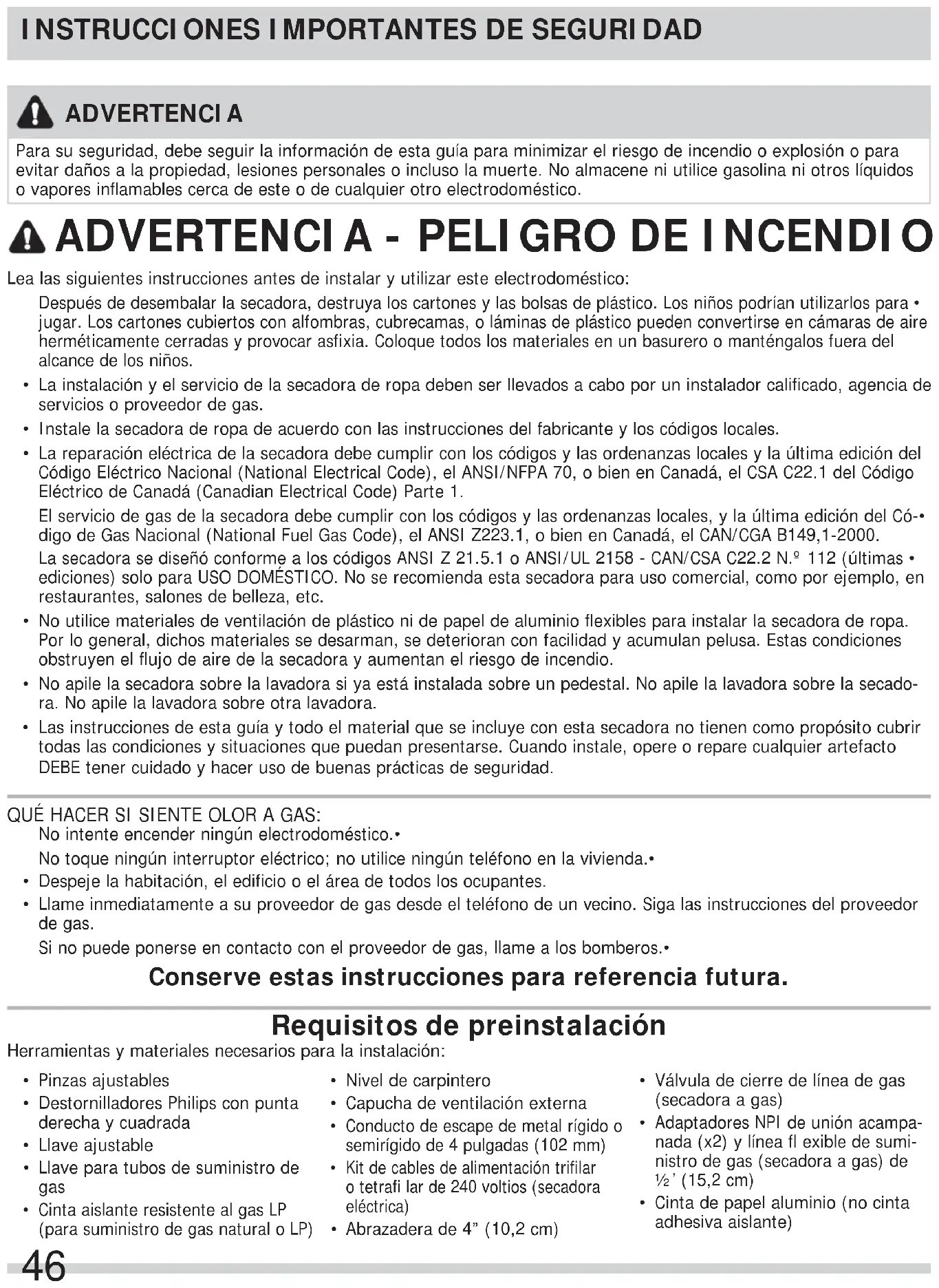 Lea las siguientes instrucciones antes de instalar y utilizar este electrodoméstico:Después de desembalar la secadora, destruya los cartones y las bolsas de plástico. Los niños podrían utilizarlos para • jugar. Los cartones cubiertos con alfombras, cubrecamas, o láminas de plástico pueden convertirse en cámaras de aire herméticamente cerradas y provocar asfi xia. Coloque todos los materiales en un basurero o manténgalos fuera del alcance de los niños. La instalación y el servicio de la secadora de ropa deben ser llevados a cabo por un instalador califi cado, agencia de • servicios o proveedor de gas. Instale la secadora de ropa de acuerdo con las instrucciones del fabricante y los códigos locales.• La reparación eléctrica de la secadora debe cumplir con los códigos y las ordenanzas locales y la última edición del • Código Eléctrico Nacional (National Electrical Code), el ANSI/NFPA 70, o bien en Canadá, el CSA C22.1 del Código Eléctrico de Canadá (Canadian Electrical Code) Parte 1.El servicio de gas de la secadora debe cumplir con los códigos y las ordenanzas locales, y la última edición del Có-• digo de Gas Nacional (National Fuel Gas Code), el ANSI Z223.1, o bien en Canadá, el CAN/CGA B149,1-2000.La secadora se diseñó conforme a los códigos ANSI Z 21.5.1 o ANSI/UL 2158 - CAN/CSA C22.2 N.º 112 (últimas • ediciones) solo para USO DOMÉSTICO. No se recomienda esta secadora para uso comercial, como por ejemplo, en restaurantes, salones de belleza, etc. No utilice materiales de ventilación de plástico ni de papel de aluminio fl exibles para instalar la secadora de ropa. • Por lo general, dichos materiales se desarman, se deterioran con facilidad y acumulan pelusa. Estas condiciones obstruyen el fl ujo de aire de la secadora y aumentan el riesgo de incendio. No apile la secadora sobre la lavadora si ya está instalada sobre un pedestal. No apile la lavadora sobre la secado-• ra. No apile la lavadora sobre otra lavadora. Las instrucciones de esta guía y todo el material que se incluye con esta secadora no tienen como propósito cubrir • todas las condiciones y situaciones que puedan presentarse. Cuando instale, opere o repare cualquier artefacto DEBE tener cuidado y hacer uso de buenas prácticas de seguridad. QUÉ HACER SI SIENTE OLOR A GAS: No intente encender ningún electrodoméstico.• No toque ningún interruptor eléctrico; no utilice ningún teléfono en la vivienda.• Despeje la habitación, el edifi cio o el área de todos los ocupantes.• Llame inmediatamente a su proveedor de gas desde el teléfono de un vecino. Siga las instrucciones del proveedor • de gas.Si no puede ponerse en contacto con el proveedor de gas, llame a los bomberos.• Requisitos de preinstalación Herramientas y materiales necesarios para la instalación:Pinzas ajustables• Destornilladores Philips con punta • derecha y cuadradaLlave ajustable• Llave para tubos de suministro de • gas Cinta aislante resistente al gas LP • (para suministro de gas natural o LP)Nivel de carpintero• Capucha de ventilación externa• Conducto de escape de metal rígido o • semirígido de 4 pulgadas (102 mm) Kit de cables de alimentación trifi lar • o tetrafi lar de 240 voltios (secadora eléctrica)Abrazadera de 4” (10,2 cm)• Válvula de cierre de línea de gas • (secadora a gas)Adaptadores NPI de unión acampa-• nada (x2) y línea fl exible de sumi-nistro de gas (secadora a gas) de ½’ (15,2 cm)Cinta de papel aluminio (no cinta • adhesiva aislante) Conserve estas instrucciones para referencia futura. ADVERTENCIA Para su seguridad, debe seguir la información de esta guía para minimizar el riesgo de incendio o explosión o para evitar daños a la propiedad, lesiones personales o incluso la muerte. No almacene ni utilice gasolina ni otros líquidos o vapores infl amables cerca de este o de cualquier otro electrodoméstico.