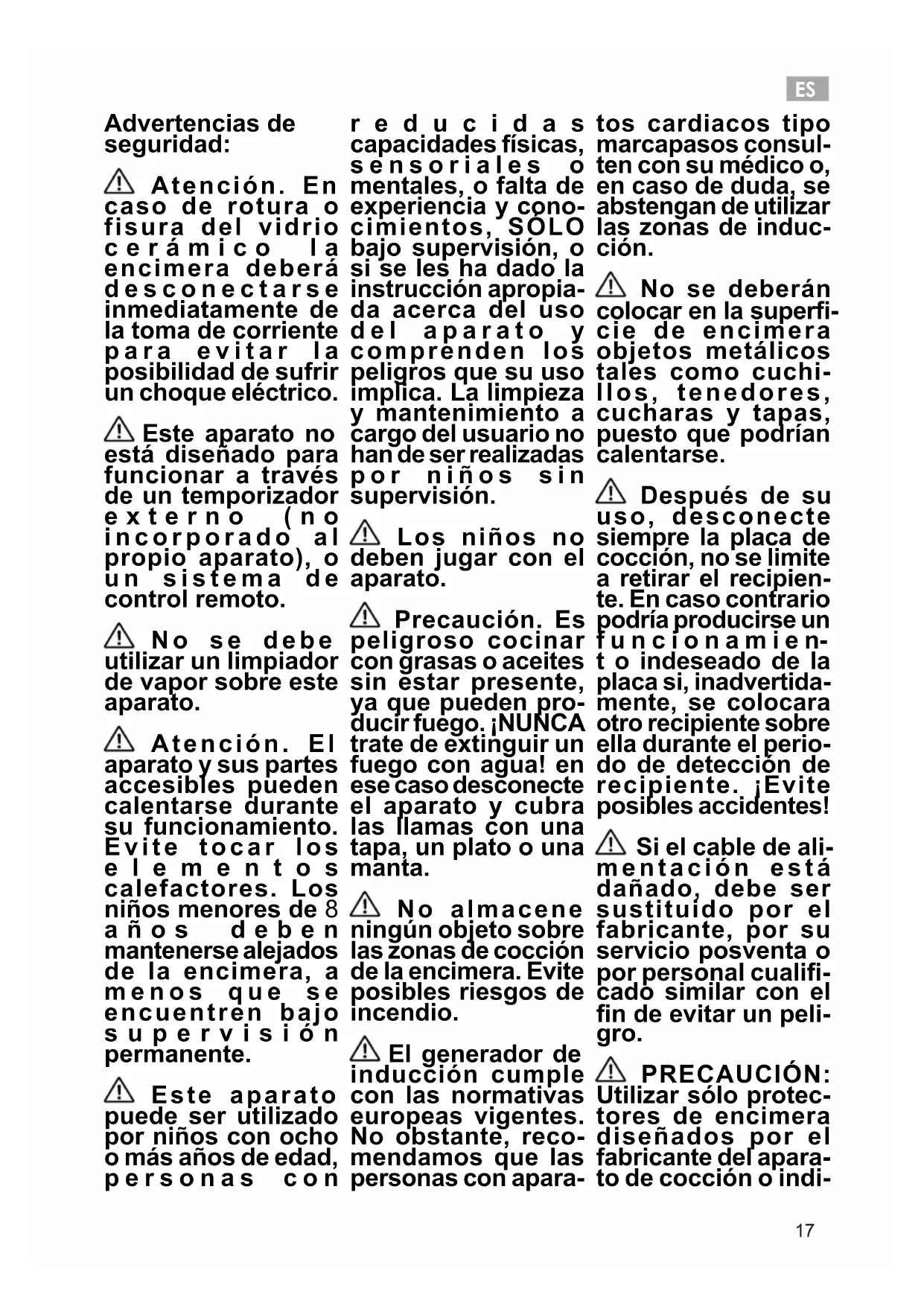 Advertencias de seguridad: Atención. En caso de rotura o fisura del vidrio cerámico la encimera deberá desconectarse inmediatamente de la toma de corriente para evitar la posibilidad de sufrir un choque eléctrico. Este aparato no está diseñado para funcionar a través de un temporizador externo (no incorporado al propio aparato), o un sistema de control remoto. No se debe utilizar un limpiador de vapor sobre este aparato. Atención. El aparato y sus partes accesibles pueden calentarse durante su funcionamiento. Evite tocar los elementos calefactores. Los niños menores de 8 años deben mantenerse alejados de la encimera, a menos que se encuentren bajo supervisión permanente. Este aparato puede ser utilizado por niños con ocho o más años de edad, personas con reducidas capacidades físicas, sensoriales o mentales, o falta de experiencia y cono- cimientos, SÓLO bajo supervisión, o si se les ha dado la instrucción apropia- da acerca del uso del aparato y comprenden los peligros que su uso implica. La limpieza y mantenimiento a cargo del usuario no han de ser realizadas por niños sin supervisión. Los niños no deben jugar con el aparato. Precaución. Es peligroso cocinar con grasas o aceites sin estar presente, ya que pueden pro- ducir fuego. ¡NUNCA trate de extinguir un fuego con agua! en ese caso desconecte el aparato y cubra las llamas con una tapa, un plato o una manta. No almacene ningún objeto sobre las zonas de cocción de la encimera. Evite posibles riesgos de incendio. El generador de inducción cumple con las normativas europeas vigentes. No obstante, reco- mendamos que las personas con apara- tos cardiacos tipo marcapasos consul- ten con su médico o, en caso de duda, se abstengan de utilizar las zonas de induc- ción. No se deberán colocar en la super- cie de encimera objetos metálicos tales como cuchi- llos, tenedores, cucharas y tapas, puesto que podrían calentarse. Después de su uso, desconecte siempre la placa de cocción, no se limite a retirar el recipien- te. En caso contrario podría producirse un f u n c i o n a m i e n- t o indeseado de la placa si, inadvertida- mente, se colocara otro recipiente sobre ella durante el perio- do de detección de recipiente. ¡Evite posibles accidentes! Si el cable de ali- mentación está dañado, debe ser sustituido por el fabricante, por su servicio posventa o por personal cuali- cado similar con el n de evitar un peli- gro. PRECAUCIÓN: Utilizar sólo protec- tores de encimera diseñados por el fabricante del apara- to de cocción o indi-ES