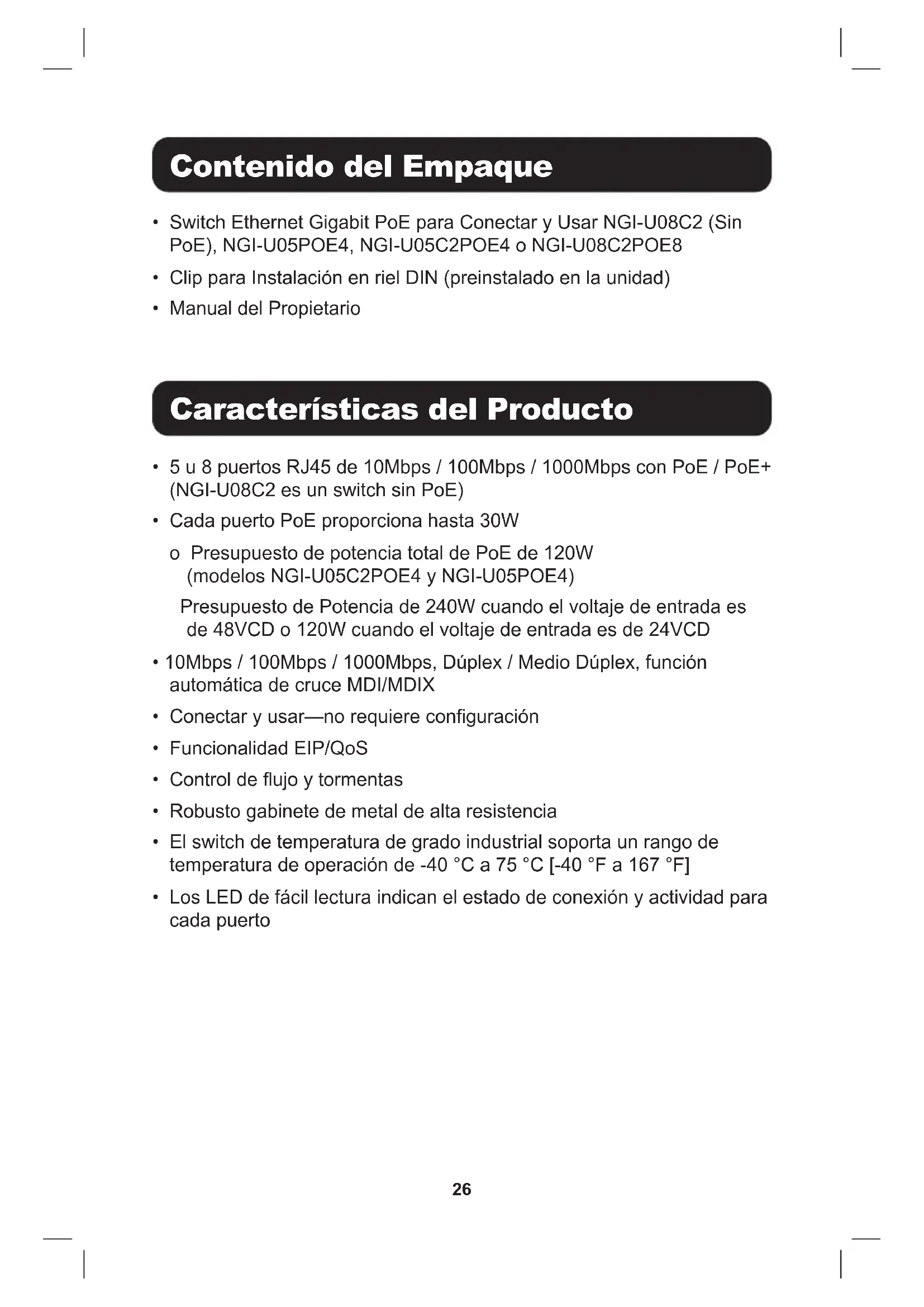 1 salida de relevador de alarma para pérdida de energía46 Specications Modelo NGI-U08C2 (Sin PoE) NGI-U05C2POE4 NGI-U05POE4 NGI-U08C2POE8 Ambiental Temperatura de Operación -40 °C ~ 75 °C [-40 °F ~ 167 °F] -10 °C ~ 60 °C [14 °F ~ 140 °F] -10 °C ~ 60 °C [14 °F ~ 140 °F] -40 °C ~ 75 °C [-40 °F ~ 167 °F] Temperatura de Almacenamiento -40 °C ~ 85 °C [-40 °F ~ 185 °F] -40 °C ~ 85 °C [-40 °F ~ 185 °F] -40 °C ~ 85 °C [-40 °F ~ 185 °F] -40 °C ~ 85 °C [-40 °F ~ 185 °F] Humedad de Operación De 5% a 95% de HR (sin condensación) De 5% a 95% de HR (sin condensación) De 5% a 95% de HR (sin condensación) De 5% a 95% de HR (sin condensación) Humedad de Almacenamiento De 5% a 95% de HR (sin condensación) De 5% a 95% de HR (sin condensación) De 5% a 95% de HR (sin condensación) De 5% a 95% de HR (sin condensación) Altitud de Operación 2000 m [6561 pies] 2000 m [6561 pies] 2000 m [6561 pies] 2000 m [6561 pies] Aprobaciones Regulatorias EMI/EMC FCC Parte 15 EN 55011 EN 61000-6-4 EN 61000-6-2 EN 55032 EN 55024 FCC Parte 15 EN 55011 EN 61000-6-4 EN 61000-6-2 EN 55032 EN 55024 FCC Parte 15 EN 55011 EN 61000-6-4 EN 61000-6-2 EN 55032 EN 55024 FCC Parte 15 EN 55011 EN 61000-6-4 EN 61000-6-2 EN 55032 EN 55024 ATENCIÓN: Si el switch se usa de una manera no especicada aquí, la protección proporcionada por el switch puede verse afectada.47 Registro de la Garantía y del Producto Garantía Limitada de 3 años El vendedor garantiza que este producto, si se usa de acuerdo con todas las instrucciones aplicables, está libre de defectos en cuanto a materiales y mano de obra por un período de tres (3) años a partir de la fecha de compra inicial. Si el producto resulta defectuoso en cuanto a materiales o mano de obra dentro de ese período, el vendedor reparará o reemplazará el producto a su entera discreción. ESTA GARANTÍA NO SE APLICA AL DESGASTE NORMAL O A LOS DAÑOS QUE RESULTEN DE ACCIDENTES, USO INCORRECTO, USO INDEBIDO O NEGLIGENCIA. EL VENDEDOR NO OTORGA GARANTÍAS EXPRESAS DISTINTAS A LA ESTIPULADA EN EL PRESENTE. SALVO EN LA MEDIDA EN QUE LO PROHÍBAN LAS LEYES APLICABLES, TODAS LAS GARANTÍAS IMPLÍCITAS, INCLUIDAS TODAS LAS GARANTÍAS DE COMERCIALIZACIÓN O IDONEIDAD, ESTÁN LIMITADAS EN CUANTO A DURACIÓN AL PERÍODO DE GARANTÍA ESTABLECIDO; ASIMISMO, ESTA GARANTÍA EXCLUYE EXPRESAMENTE TODOS LOS DAÑOS INCIDENTALES E INDIRECTOS. (Algunos estados no permiten limitaciones en cuanto a la duración de una garantía y algunos estados no permiten la exclusión o limitación de daños incidentales o indirectos, de modo que es posible que las limitaciones anteriores no se apliquen a usted. Esta garantía le otorga derechos legales especícos y es posible que le asistan otros derechos que pueden variar de una jurisdicción a otra). ADVERTENCIA: antes de usarlo, cada usuario debe tener cuidado al determinar si este dispositivo es adecuado o seguro para el uso previsto. Ya que las aplicaciones individuales están sujetas a gran variación, el fabricante no garantiza la adecuación de estos dispositivos para alguna aplicación especíca. Aviso de FCC, Clase B Este dispositivo cumple con la parte 15 del Reglamento de la FCC. La operación está sujeta a las siguientes dos condiciones: (1) Este dispositivo no puede causar interferencia perjudicial, y (2) este dispositivo debe aceptar cualquier interferencia recibida, incluso aquella que pudiera causar un funcionamiento no deseado. Nota: Se ha comprobado que este equipo cumple los límites para dispositivos digitales de Clase B, de acuerdo con el apartado 15 del Reglamento de la FCC. Estos límites están diseñados para proporcionar una protección razonable contra interferencias perjudiciales en una instalación residencial. Este equipo genera, usa y puede radiar energía de radiofrecuencia y si no se instala y usa de acuerdo con las instrucciones, puede causar interferencia perjudicial a las radiocomunicaciones. Sin embargo, no hay garantía de que no ocurra interferencia en una instalación especíca.48 Warranty and Product Registration Si este equipo causa interferencia perjudicial a la recepción de radio o televisión, que puede determinarse apagando y encendiendo el equipo, se recomienda al usuario intentar corregir la interferencia por medio de una o más de las siguientes medidas:
