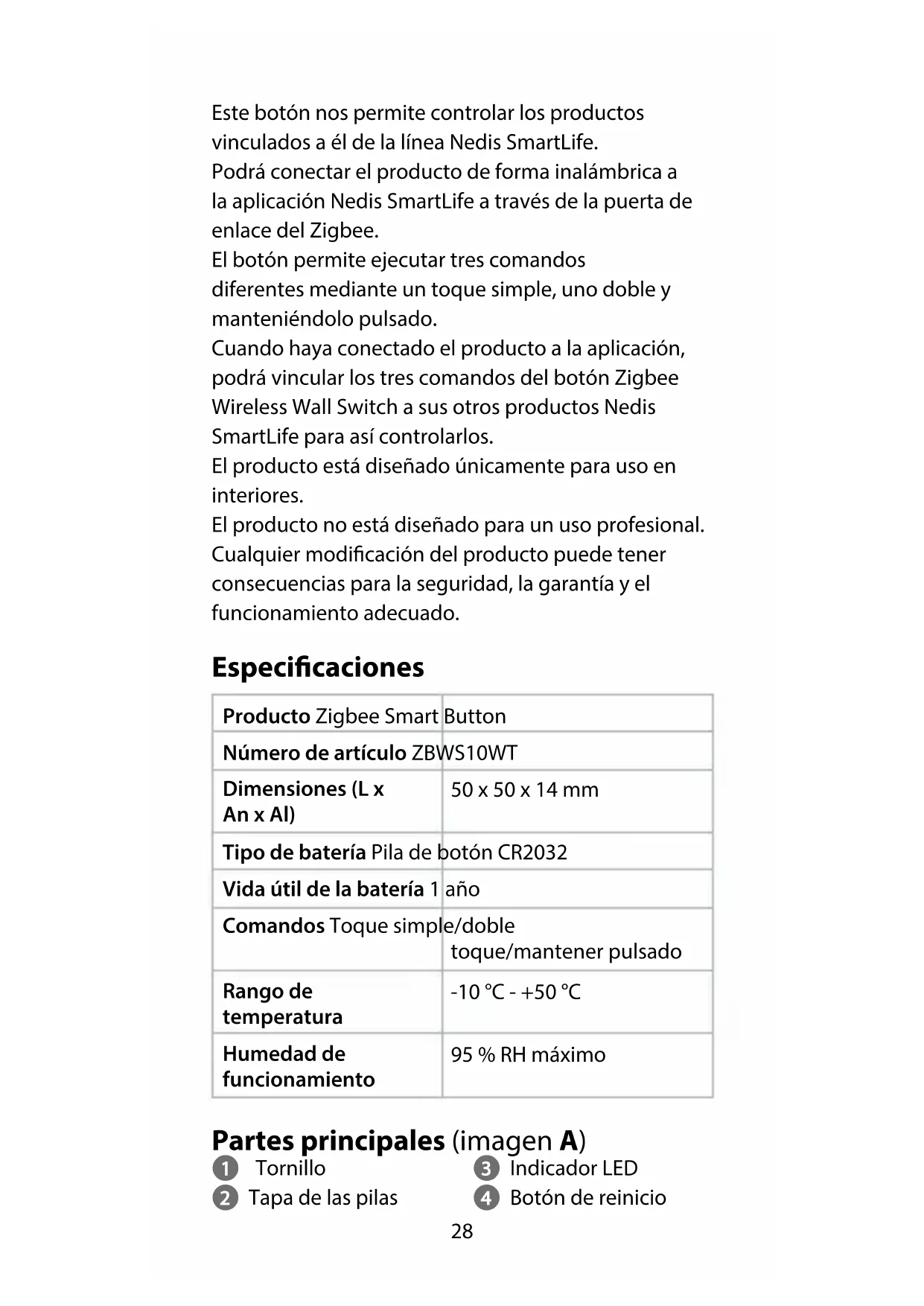 Guía de inicio rápido Zigbee Smart Button ZBWS10WT Uso previsto por el fabricante El ZBWS10WT de Nedis es un botón inteligente inalámbrico alimentado por pilas.28 Este botón nos permite controlar los productos vinculados a él de la línea Nedis SmartLife. Podrá conectar el producto de forma inalámbrica a la aplicación Nedis SmartLife a través de la puerta de enlace del Zigbee. El botón permite ejecutar tres comandos diferentes mediante un toque simple, uno doble y manteniéndolo pulsado. Cuando haya conectado el producto a la aplicación, podrá vincular los tres comandos del botón Zigbee Wireless Wall Switch a sus otros productos Nedis SmartLife para así controlarlos. El producto está diseñado únicamente para uso en interiores. El producto no está diseñado para un uso profesional. Cualquier modicación del producto puede tener consecuencias para la seguridad, la garantía y el funcionamiento adecuado. Especicaciones Producto Zigbee Smart Button Número de artículo ZBWS10WT Dimensiones (L x An x Al) 50 x 50 x 14 mm Tipo de batería Pila de botón CR2032 Vida útil de la batería 1 año Comandos Toque simple/doble toque/mantener pulsado Rango de temperatura -10 °C - +50 °C Humedad de funcionamiento 95 % RH máximo Partes principales (imagen A) 1 Tornillo 2 Tapa de las pilas 3 Indicador LED 4 Botón de reinicio29 Instrucciones de seguridad
