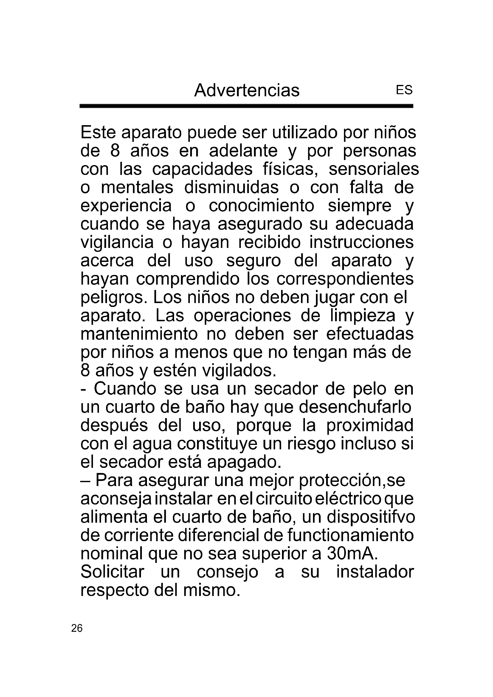 ENTSORGUNG BENUTZERINFORMATIONEN 25Este aparato puede ser utilizado por niños de 8 años en adelante y por personas con las capacidades físicas, sensoriales o mentales disminuidas o con falta de experiencia o conocimiento siempre y cuando se haya asegurado su adecuada vigilancia o hayan recibido instrucciones acerca del uso seguro del aparato y hayan comprendido los correspondientes peligros. Los niños no deben jugar con el aparato. Las operaciones de limpieza y mantenimiento no deben ser efectuadas por niños a menos que no tengan más de 8 años y estén vigilados. - Cuando se usa un secador de pelo en un cuarto de baño hay que desenchufarlo después del uso, porque la proximidad con el agua constituye un riesgo incluso si el secador está apagado. – Para asegurar una mejor protección,se aconseja instalar en el circuito eléctrico que alimenta el cuarto de baño, un dispositifvo de corriente diferencial de functionamiento nominal que no sea superior a 30mA. Solicitar un consejo a su instalador respecto del mismo. Advertencias