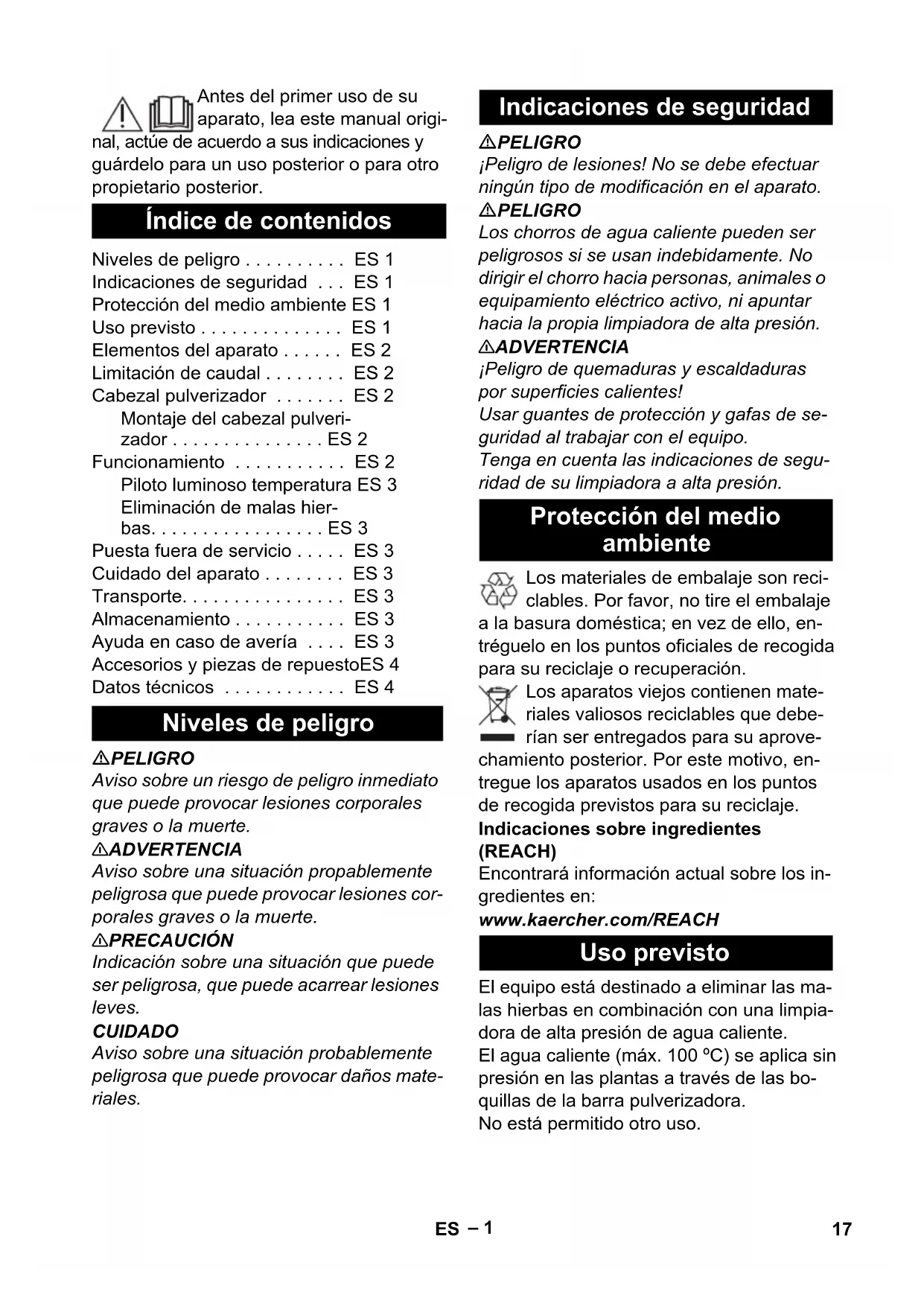 HDS 1000 De 2.113-071.0 HDS 1000 Be 2.113-071.0 HDS 13/20 DeTr.1 2.113-026.0 HDS 17/20 DeTr.1 2.113-026.0 Spuitkop Spuitkop monteren Gebruik Temperatuurweergave 15NL– 3 Hogedrukreiniger inschakelen en aan de hendel van het hogedrukpistool trek- ken. Wachten tot er heet water uit de sproei- balk stroomt. De temperatuurweergave verandert naarmate de watertemperatuur stijgt. De indicatievelden wisselen van links naar rechts in de kleur zwart naar bruin. Wanneer de balk helemaal rechts groen wordt, is het apparaat gebruiks- klaar. Spuitkop langzaam over het onkruid be- wegen. Indien nodig beweging meerdere keren herhalen. Opmerking Een optimale werking wordt bereikt wan- neer het hete water bijna drukloos met lich- te stoom uittreedt. 몇 WAARSCHUWING Gevaar voor verbranding! WR10 voor de demontage laten afkoelen. Na de werkzaamheden de spuitkop ge- durende twee minuten met koud water gebruiken om af te koelen. Indien nodig, de spuitkop met vers wa- ter afspoelen. Sproeiers aan de spuitkop regelmatig controleren op verstoppingen. Neem bij het transport het gewicht van het apparaat in acht. Neem bij de opslag het gewicht van het apparaat in acht. Apparaat op een vorstvrije plaats bewa- ren. Bij de spuitkop treedt stoom uit: Temperatuurinstelling aan de hoge- drukreiniger verminderen. Water treedt met te veel druk uit: Powersproeier in de schroefverbinding monteren. Passende powersproeier (zie tabel) se- lecteren. Hogedrukreiniger schakelt uit / brander aan hogedrukreiniger start niet: Sproeiers aan de spuitkop controleren op verontreiniging. Sproeiers aan de spuitkop controleren op verkalking. Gebruik alleen origineel toebehoren en ori- ginele reserveonderdelen. Deze garande- ren dat het apparaat veilig en zonder storin- gen functioneert. Informatie over het toebehoren en de re- serveonderdelen vindt u op www.kaercher.com. Onkruidverwijdering Buitenwerkingstelling Zorg Transport Opslag Hulp bij storingen Toebehoren en reserveonderdelen Technische gegevens WR 10 Werkbreedte 100 mm Gewenste aanvoertempera- tuur min. 90 °C Gewenste aanvoertempera- tuur max. 100 °C Gewicht (kg) 0,3 16 NL– 1 Antes del primer uso de su aparato, lea este manual origi- nal, actúe de acuerdo a sus indicaciones y guárdelo para un uso posterior o para otro propietario posterior. PELIGRO Aviso sobre un riesgo de peligro inmediato que puede provocar lesiones corporales graves o la muerte. 몇 ADVERTENCIA Aviso sobre una situación propablemente peligrosa que puede provocar lesiones cor- porales graves o la muerte. 몇 PRECAUCIÓN Indicación sobre una situación que puede ser peligrosa, que puede acarrear lesiones leves. CUIDADO Aviso sobre una situación probablemente peligrosa que puede provocar daños mate- riales. PELIGRO ¡Peligro de lesiones! No se debe efectuar ningún tipo de modificación en el aparato. PELIGRO Los chorros de agua caliente pueden ser peligrosos si se usan indebidamente. No dirigir el chorro hacia personas, animales o equipamiento eléctrico activo, ni apuntar hacia la propia limpiadora de alta presión. 몇 ADVERTENCIA ¡Peligro de quemaduras y escaldaduras por superficies calientes! Usar guantes de protección y gafas de se- guridad al trabajar con el equipo. Tenga en cuenta las indicaciones de segu- ridad de su limpiadora a alta presión. Los materiales de embalaje son reci- clables. Por favor, no tire el embalaje a la basura doméstica; en vez de ello, en- tréguelo en los puntos oficiales de recogida para su reciclaje o recuperación. Los aparatos viejos contienen mate- riales valiosos reciclables que debe- rían ser entregados para su aprove- chamiento posterior. Por este motivo, en- tregue los aparatos usados en los puntos de recogida previstos para su reciclaje. Indicaciones sobre ingredientes (REACH) Encontrará información actual sobre los in- gredientes en: www.kaercher.com/REACH El equipo está destinado a eliminar las ma- las hierbas en combinación con una limpia- dora de alta presión de agua caliente. El agua caliente (máx. 100 ºC) se aplica sin presión en las plantas a través de las bo- quillas de la barra pulverizadora. No está permitido otro uso. Índice de contenidos Niveles de peligro . . . . . . . . . . ES 1 Indicaciones de seguridad . . . ES 1 Protección del medio ambiente ES 1 Uso previsto . . . . . . . . . . . . . . ES 1 Elementos del aparato . . . . . . ES 2 Limitación de caudal . . . . . . . . ES 2 Cabezal pulverizador . . . . . . . ES 2 Montaje del cabezal pulveri- zador . . . . . . . . . . . . . . . ES 2 Funcionamiento . . . . . . . . . . . ES 2 Piloto luminoso temperatura ES 3 Eliminación de malas hier- bas. . . . . . . . . . . . . . . . . ES 3 Puesta fuera de servicio . . . . . ES 3 Cuidado del aparato . . . . . . . . ES 3 Transporte. . . . . . . . . . . . . . . . ES 3 Almacenamiento . . . . . . . . . . . ES 3 Ayuda en caso de avería . . . . ES 3 Accesorios y piezas de repuestoES 4 Datos técnicos . . . . . . . . . . . . ES 4 Niveles de peligro Indicaciones de seguridad Protección del medio ambiente Uso previsto 17ES– 2 1 Lanza dosificadora 2 boquilla de aumento de la velocidad de salida del vapor 3 unión roscada 4 Indicación de temperatura 5 Cabezal pulverizador Para garantizar que la temperatura del agua siempre sea igual de alta (superior a 90 °C), se debe colocar una boquilla de alto rendimiento en la atornilladura del cabezal pulverizador para limitar el caudal. Aviso La boquilla de alto rendimiento necesaria está adaptada a la limpiadora a alta presión correspondiente y se tiene que pedir por separado. Aviso: las boquillas de alto rendimiento para limpiadoras de alta presión de agua caliente que no se indiquen en este docu- mento tendrán que consultarse con el ser- vicio técnico autorizado. Deslizar la boquilla de alto rendimiento en la atornilladura. Atornillar el cabezal pulverizador al tubo pulverizador. 몇 ADVERTENCIA Peligro de quemaduras No dirigir el chorro de agua hacia personas o animales. Durante el servicio, no tocar WR 