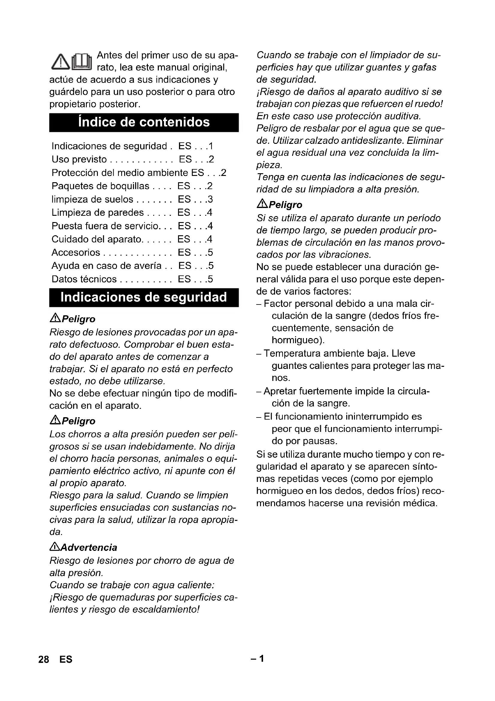 - 0,4 27NL– 1 Antes del primer uso de su apa- rato, lea este manual original, actúe de acuerdo a sus indicaciones y guárdelo para un uso posterior o para otro propietario posterior. Peligro Riesgo de lesiones provocadas por un apa- rato defectuoso. Comprobar el buen esta- do del aparato antes de comenzar a trabajar. Si el aparato no está en perfecto estado, no debe utilizarse. No se debe efectuar ningún tipo de modifi- cación en el aparato. Peligro Los chorros a alta presión pueden ser peli- grosos si se usan indebidamente. No dirija el chorro hacia personas, animales o equi- pamiento eléctrico activo, ni apunte con él al propio aparato. Riesgo para la salud. Cuando se limpien superficies ensuciadas con sustancias no- civas para la salud, utilizar la ropa apropia- da. 몇 Advertencia Riesgo de lesiones por chorro de agua de alta presión. Cuando se trabaje con agua caliente: ¡Riesgo de quemaduras por superficies ca- lientes y riesgo de escaldamiento! Cuando se trabaje con el limpiador de su- perficies hay que utilizar guantes y gafas de seguridad. ¡Riesgo de daños al aparato auditivo si se trabajan con piezas que refuercen el ruedo! En este caso use protección auditiva. Peligro de resbalar por el agua que se que- de. Utilizar calzado antideslizante. Eliminar el agua residual una vez concluida la lim- pieza. Tenga en cuenta las indicaciones de segu- ridad de su limpiadora a alta presión. Peligro Si se utiliza el aparato durante un período de tiempo largo, se pueden producir pro- blemas de circulación en las manos provo- cados por las vibraciones. No se puede establecer una duración ge- neral válida para el uso porque este depen- de de varios factores: – Factor personal debido a una mala cir- culación de la sangre (dedos fríos fre- cuentemente, sensación de hormigueo). – Temperatura ambiente baja. Lleve guantes calientes para proteger las ma- nos. – Apretar fuertemente impide la circula- ción de la sangre. – El funcionamiento ininterrumpido es peor que el funcionamiento interrumpi- do por pausas. Si se utiliza durante mucho tiempo y con re- gularidad el aparato y se aparecen sínto- mas repetidas veces (como por ejemplo hormigueo en los dedos, dedos fríos) reco- mendamos hacerse una revisión médica. Índice de contenidos Indicaciones de seguridad . ES Uso previsto p. 1