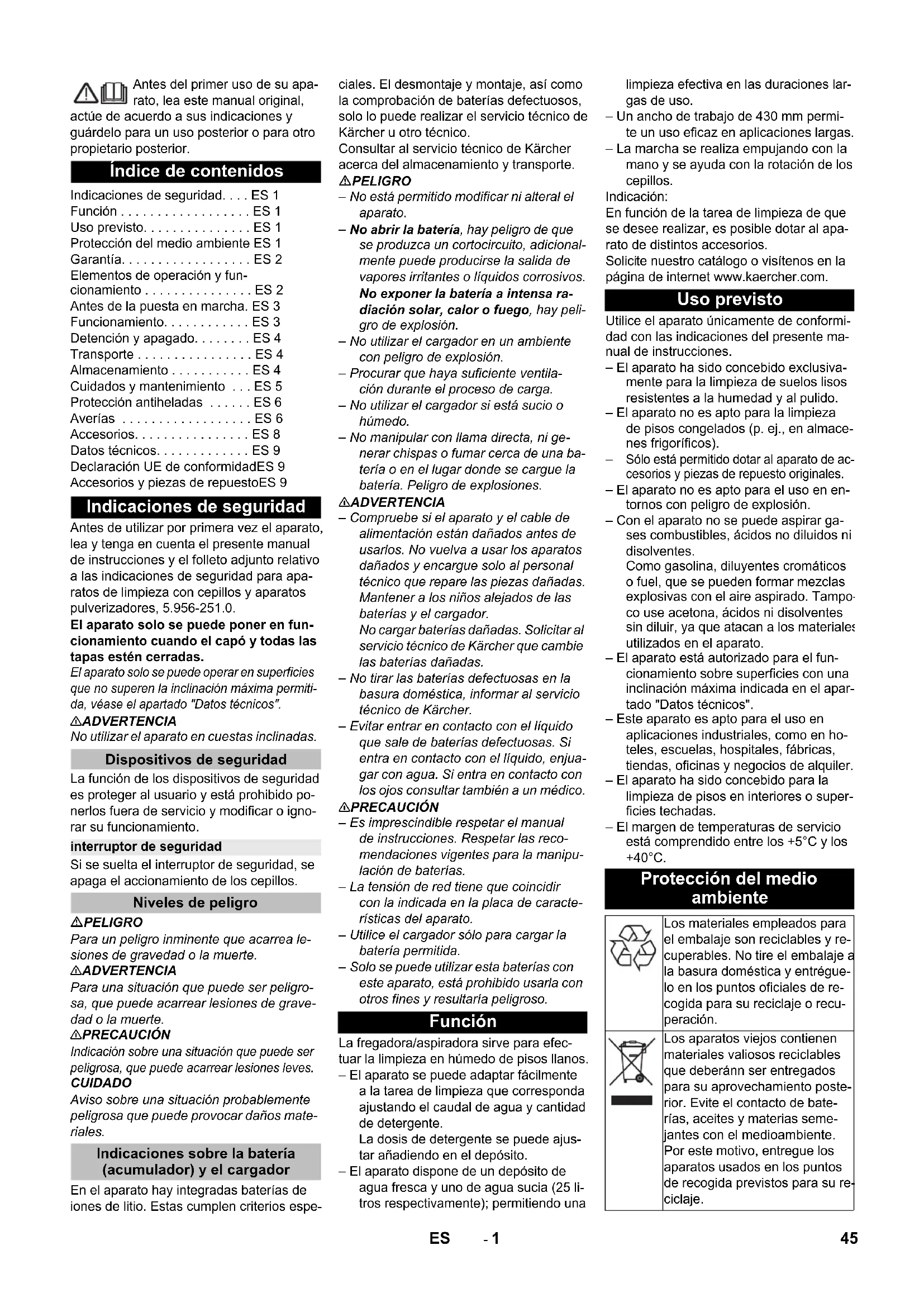 Toebehoren en reserveonderdelen Chairman of the Board of Management Director Regulatory Affairs & Certification 44 NL- 1 Antes del primer uso de su apa- rato, lea este manual original, actúe de acuerdo a sus indicaciones y guárdelo para un uso posterior o para otro propietario posterior. Antes de utilizar por primera vez el aparato, lea y tenga en cuenta el presente manual de instrucciones y el folleto adjunto relativo a las indicaciones de seguridad para apa- ratos de limpieza con cepillos y aparatos pulverizadores, 5.956-251.0. El aparato solo se puede poner en fun- cionamiento cuando el capó y todas las tapas estén cerradas. El aparato solo se puede operar en superficies que no superen la inclinación máxima permiti- da, véase el apartado "Datos técnicos". 몇 ADVERTENCIA No utilizar el aparato en cuestas inclinadas. La función de los dispositivos de seguridad es proteger al usuario y está prohibido po- nerlos fuera de servicio y modificar o igno- rar su funcionamiento. Si se suelta el interruptor de seguridad, se apaga el accionamiento de los cepillos. PELIGRO Para un peligro inminente que acarrea le- siones de gravedad o la muerte. 몇 ADVERTENCIA Para una situación que puede ser peligro- sa, que puede acarrear lesiones de grave- dad o la muerte. 몇 PRECAUCIÓN Indicación sobre una situación que puede ser peligrosa, que puede acarrear lesiones leves. CUIDADO Aviso sobre una situación probablemente peligrosa que puede provocar daños mate- riales. En el aparato hay integradas baterías de iones de litio. Estas cumplen criterios espe- ciales. El desmontaje y montaje, así como la comprobación de baterías defectuosos, solo lo puede realizar el servicio técnico de Kärcher u otro técnico. Consultar al servicio técnico de Kärcher acerca del almacenamiento y transporte. PELIGRO – No está permitido modificar ni alteral el aparato. – No abrir la batería, hay peligro de que se produzca un cortocircuito, adicional- mente puede producirse la salida de vapores irritantes o líquidos corrosivos. No exponer la batería a intensa ra- diación solar, calor o fuego, hay peli- gro de explosión. – No utilizar el cargador en un ambiente con peligro de explosión. – Procurar que haya suficiente ventila- ción durante el proceso de carga. – No utilizar el cargador si está sucio o húmedo. – No manipular con llama directa, ni ge- nerar chispas o fumar cerca de una ba- tería o en el lugar donde se cargue la batería. Peligro de explosiones. 몇 ADVERTENCIA – Compruebe si el aparato y el cable de alimentación están dañados antes de usarlos. No vuelva a usar los aparatos dañados y encargue solo al personal técnico que repare las piezas dañadas. Mantener a los niños alejados de las baterías y el cargador. No cargar baterías dañadas. Solicitar al servicio técnico de Kärcher que cambie las baterías dañadas. – No tirar las baterías defectuosas en la basura doméstica, informar al servicio técnico de Kärcher. – Evitar entrar en contacto con el líquido que sale de baterías defectuosas. Si entra en contacto con el líquido, enjua- gar con agua. Si entra en contacto con los ojos consultar también a un médico. 몇 PRECAUCIÓN – Es imprescindible respetar el manual de instrucciones. Respetar las reco- mendaciones vigentes para la manipu- lación de baterías. – La tensión de red tiene que coincidir con la indicada en la placa de caracte- rísticas del aparato. – Utilice el cargador sólo para cargar la batería permitida. – Solo se puede utilizar esta baterías con este aparato, está prohibido usarla con otros fines y resultaría peligroso. La fregadora/aspiradora sirve para efec- tuar la limpieza en húmedo de pisos llanos. – El aparato se puede adaptar fácilmente a la tarea de limpieza que corresponda ajustando el caudal de agua y cantidad de detergente. La dosis de detergente se puede ajus- tar añadiendo en el depósito. – El aparato dispone de un depósito de agua fresca y uno de agua sucia (25 li- tros respectivamente); permitiendo una limpieza efectiva en las duraciones lar- gas de uso. – Un ancho de trabajo de 430 mm permi- te un uso eficaz en aplicaciones largas. – La marcha se realiza empujando con la mano y se ayuda con la rotación de los cepillos. Indicación: En función de la tarea de limpieza de que se desee realizar, es posible dotar al apa- rato de distintos accesorios. Solici te nuestro catálogo o visítenos en la página de internet www.kaercher.com. Utilice el aparato únicamente de conformi- dad con las indicaciones del presente ma- nual de instrucciones. – El aparato ha sido concebido exclusiva- mente para la limpieza de suelos lisos resistentes a la humedad y al pulido. – El aparato no es apto para la limpieza de pisos congelados (p. ej., en almace- nes frigoríficos).