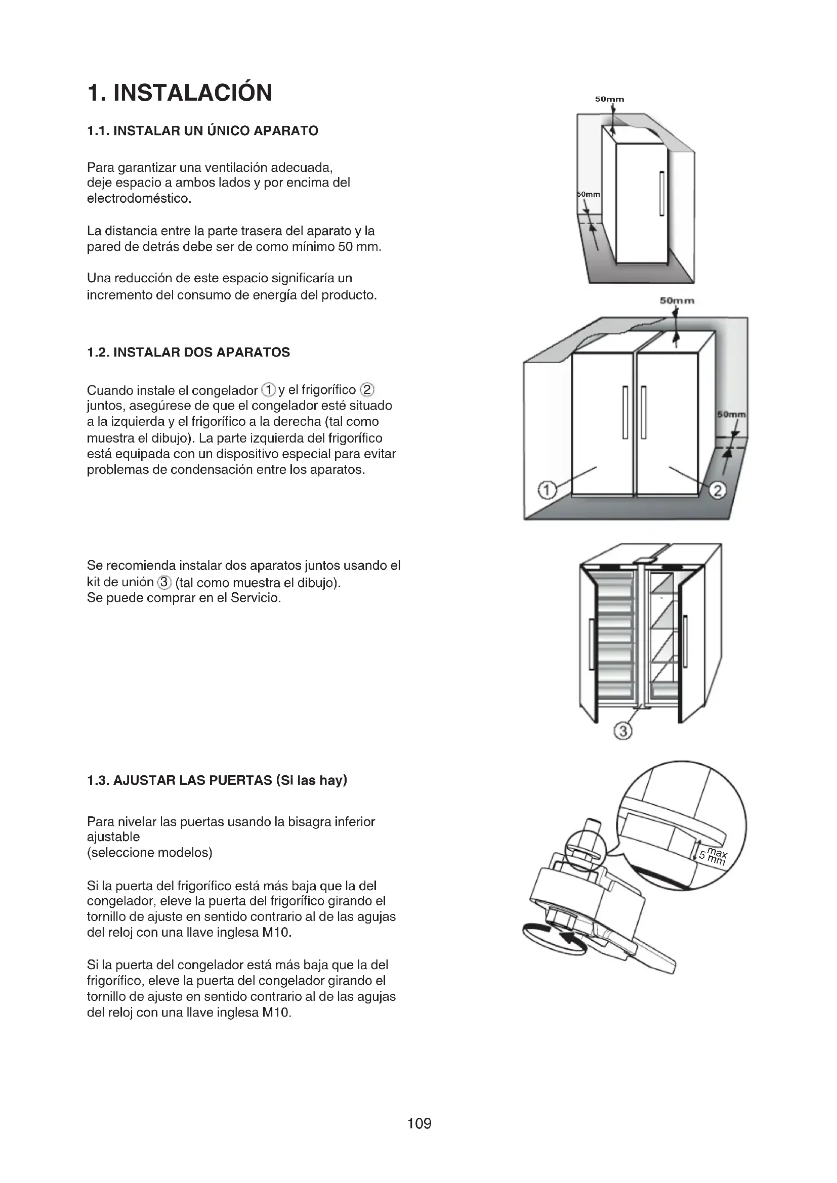 (talcomomuestraeldibujo). SepuedecomprarenelServicio. 1.3. AJUSTAR LAS PUERTAS (Si las hay) Para nivelar las puertas usando la bisagra inferior ajustable (seleccionemodelos) Silapuertadelfrigoríficoestámásbajaqueladel congelador,elevelapuertadelfrigoríficogirandoel tornillo de ajuste en sentido contrario al de las agujas delrelojconunallaveinglesaM10. Si la puerta del congelador está más baja que la del frigorífico,elevelapuertadelcongeladorgirandoel tornillo de ajuste en sentido contrario al de las agujas delrelojconunallaveinglesaM10. 50mm 50mm 5 mm max110