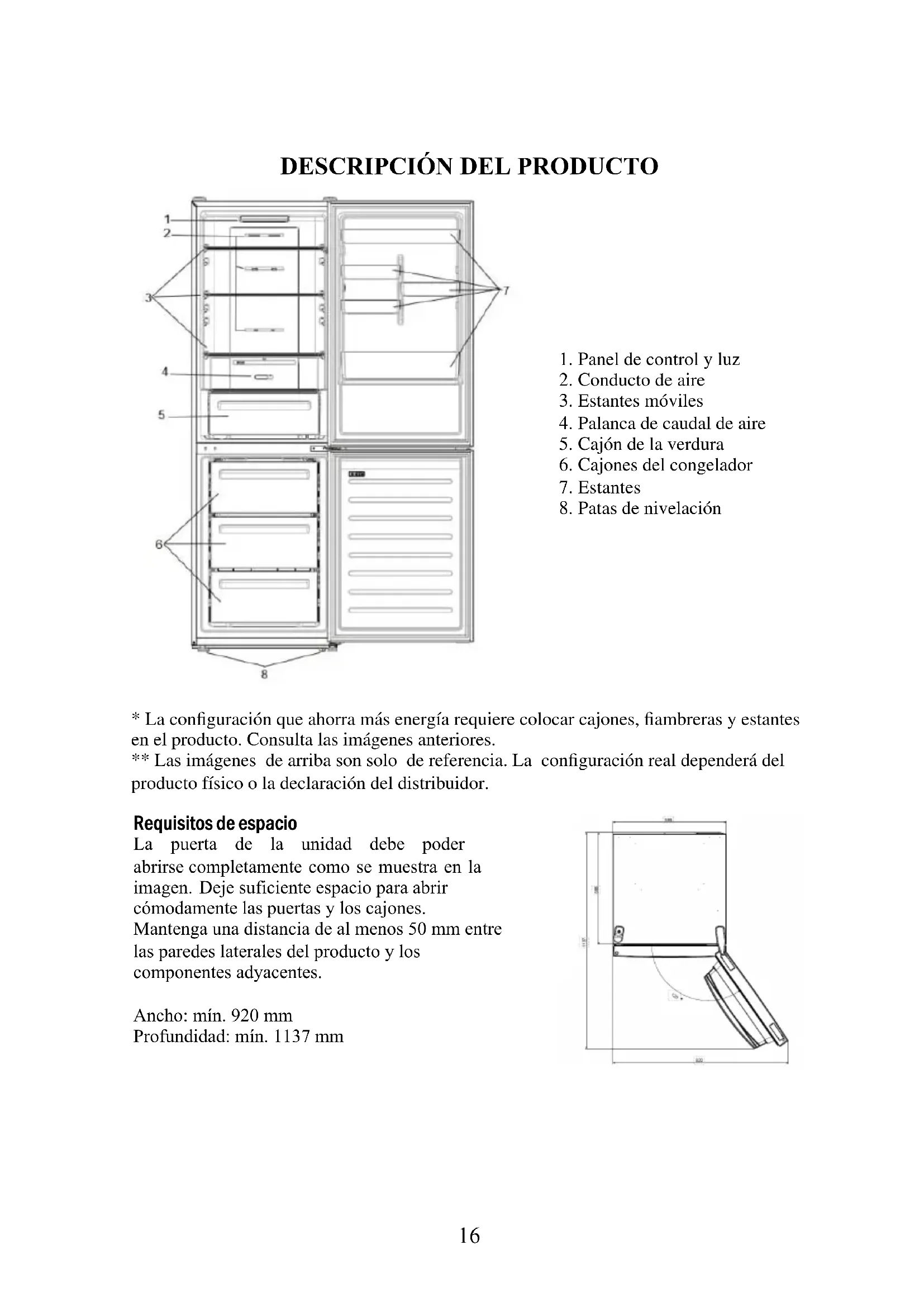 - La configuración que ahorra más energía requiere colocar cajones, fiambreras y estantes en el producto. Consulta las imágenes anteriores. ** Las imágenes de arriba son solo de referencia. La configuración real dependerá del producto físico o la declaración del distribuidor. Requisitos de espacio La puerta de la unidad debe poder abrirse completamente como se muestra en la imagen. Deje suficiente espacio para abrir cómodamente las puertas y los cajones. Mantenga una distancia de al menos 50 mm entre las paredes laterales del producto y los componentes adyacentes. Ancho: mín. 920 mm Profundidad: mín. 1137 mm17 Uso