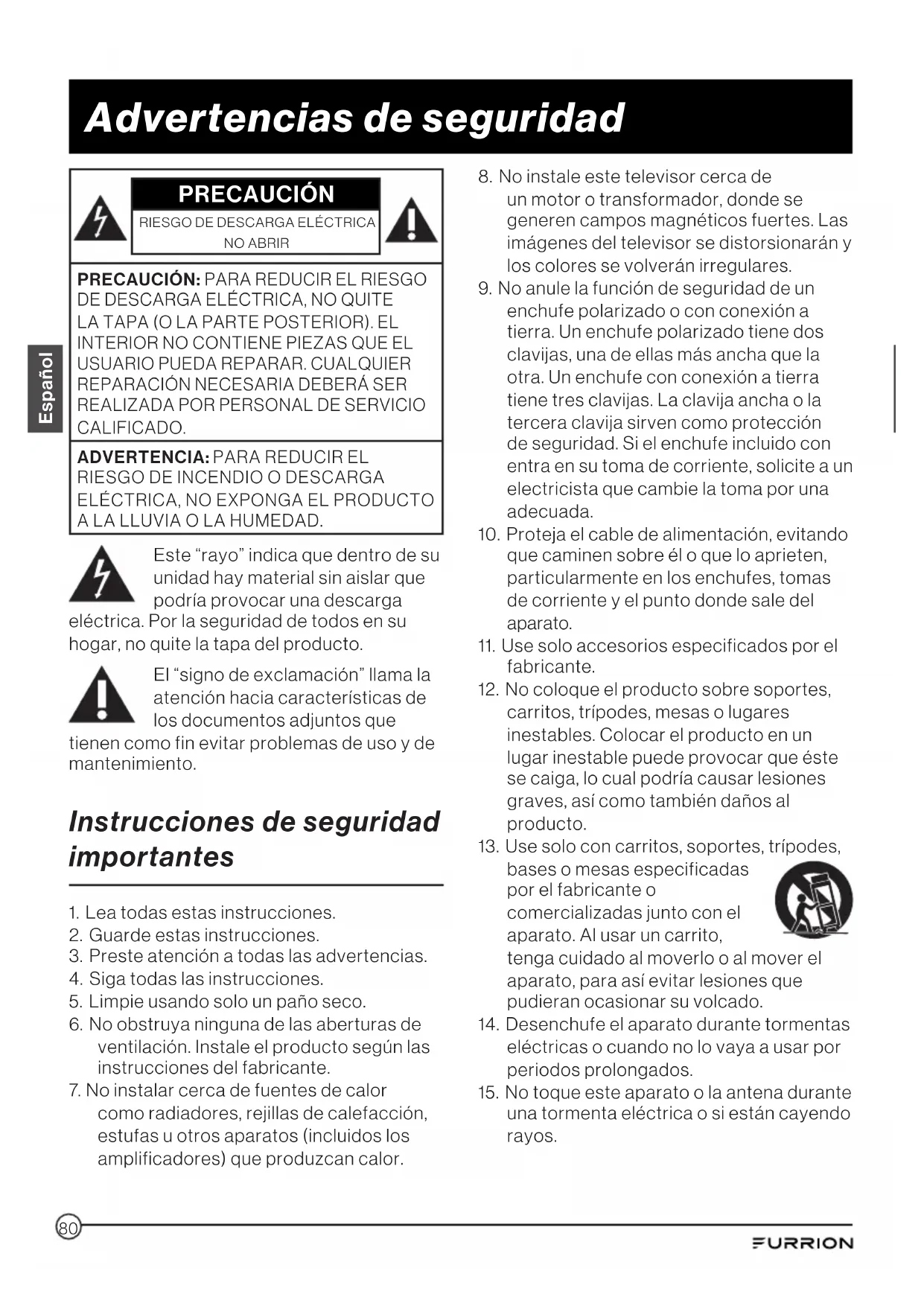 ya que esto podría exponerlo a voltajes muy altos y otros peligros. Si el televisor no funciona correctamente, desconéctelo y llame a su centro de servicio o centro de ventas autorizado. Ajuste solo los controles descritos en las instrucciones, ya que cualquier cambio o modificación no aprobada expresamente por Furrion podría anular la garantía del usuario.