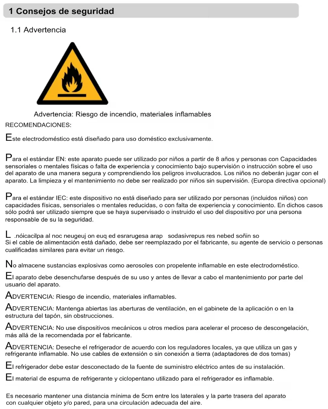 1 Consejos de seguridad Advertencia: Riesgo de incendio, materiales inflamables Este electrodoméstico está diseñado para uso doméstico exclusivamente. Para el estándar EN: este aparato puede ser utilizado por niños a partir de 8 años y personas con Capacidades sensoriales o mentales físicas o falta de experiencia y conocimiento bajo supervisión o instrucción sobre el uso del aparato de una manera segura y comprendiendo los peligros involucrados. Los niños no deberán jugar con el aparato. La limpieza y el mantenimiento no debe ser realizado por niños sin supervisión. (Europa directiva opcional) Para el estándar IEC: este dispositivo no está diseñado para ser utilizado por personas (incluidos niños) con capacidades físicas, sensoriales o mentales reducidas, o con falta de experiencia y conocimiento. En dichos casos sólo podrá ser utilizado siempre que se haya supervisado o instruido el uso del dispositivo por una persona responsable de su la seguridad. L .nóicacilpa al noc neugeuj on euq ed esrarugesa arap sodasivrepus res nebed soñin so Si el cable de alimentación está dañado, debe ser reemplazado por el fabricante, su agente de servicio o personas cualificadas similares para evitar un riesgo. Es necesario mantener una distancia mínima de 5cm entre los laterales y la parte trasera del aparato con cualquier objeto y/o pared, para una circulación adecuada del aire.2 ¡Este manual contiene información importante!