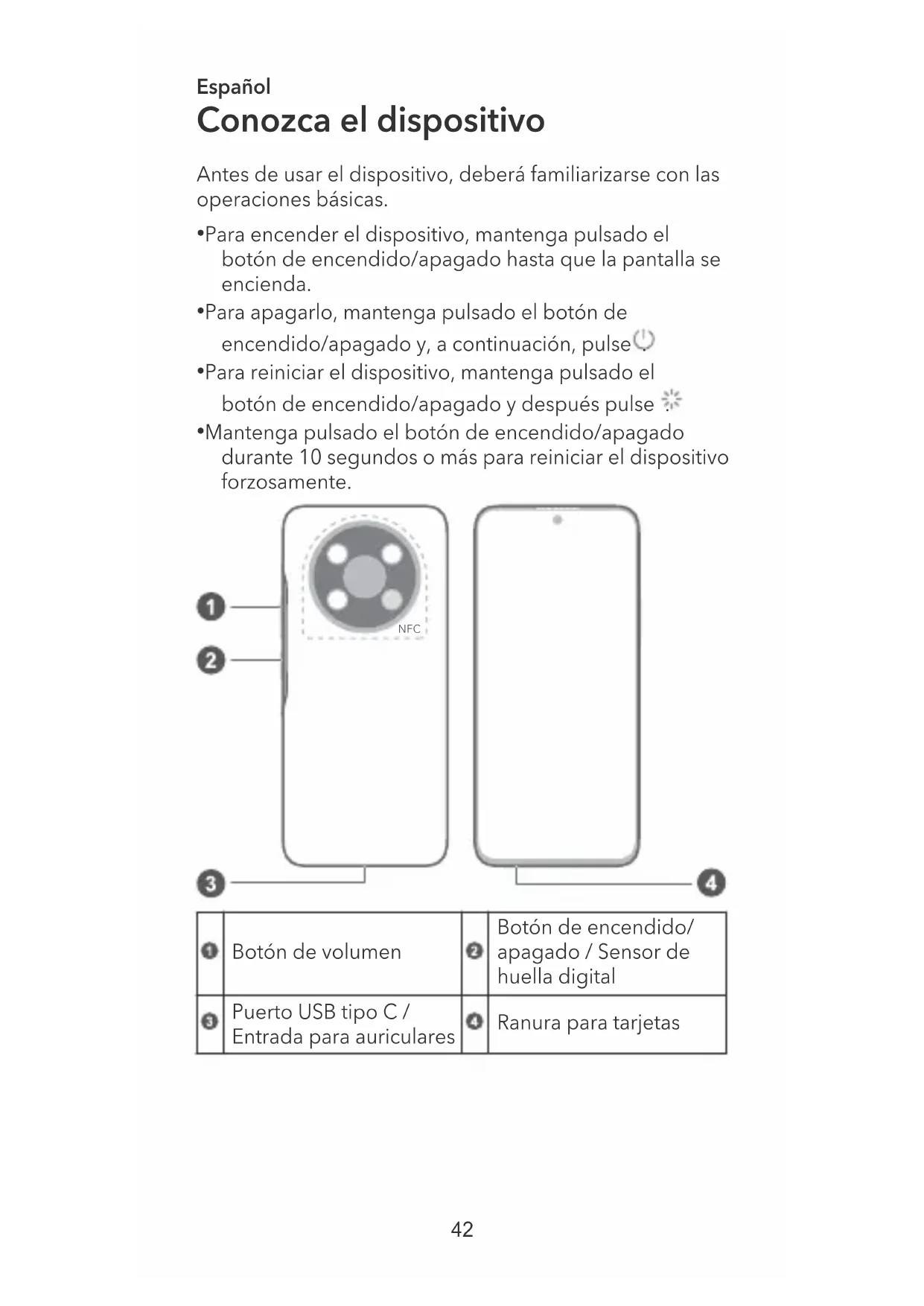 - Mantenga pulsado el botón de encendido/apagado durante 10 segundos o más para reiniciar el dispositivo forzosamente. NFC Botón de volumen Botón de encendido/ apagado / Sensor de huella digital Puerto USB tipo C / Entrada para auriculares Ranura para tarjetas 42• Mantenga el área NFC cerca de los otros dispositivos u objetos cuando utilice la función NFC.