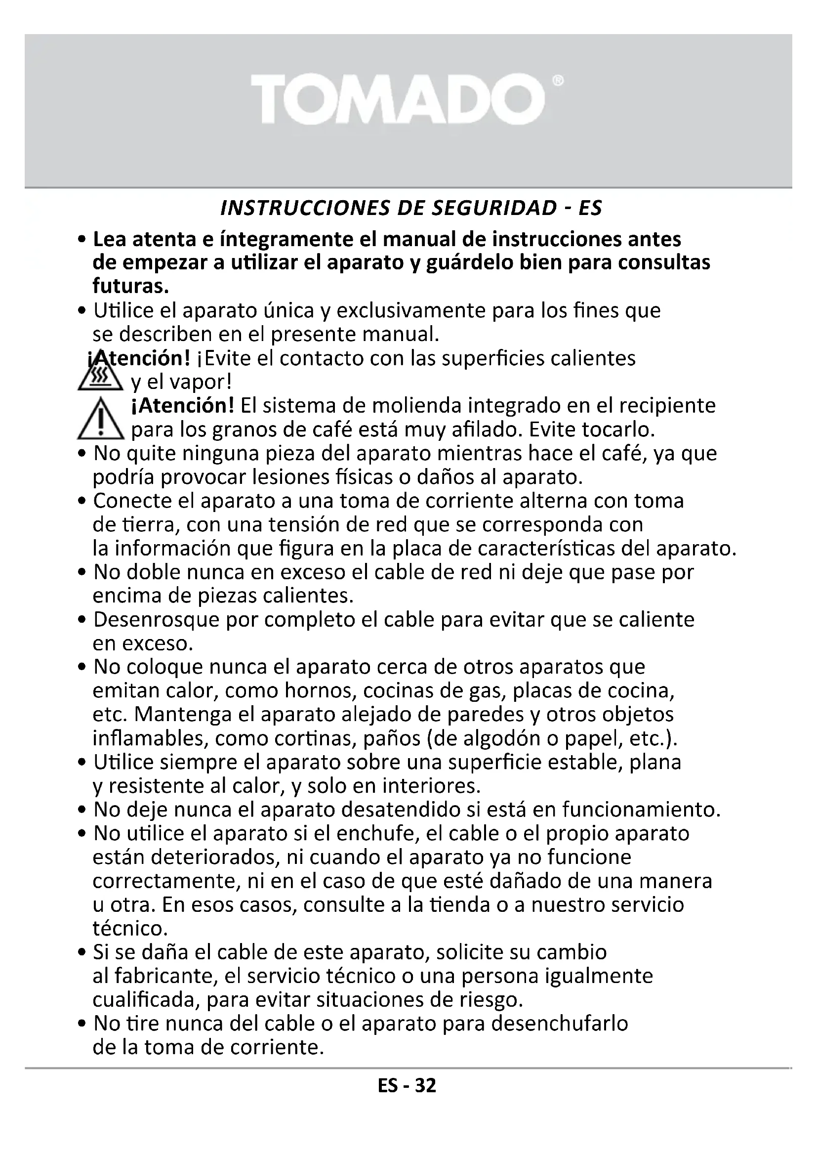 - Ulice el aparato única y exclusivamente para los nes que se describen en el presente manual. ¡Atención! ¡Evite el contacto con las supercies calientes y el vapor! ¡Atención! El sistema de molienda integrado en el recipiente para los granos de café está muy alado. Evite tocarlo.