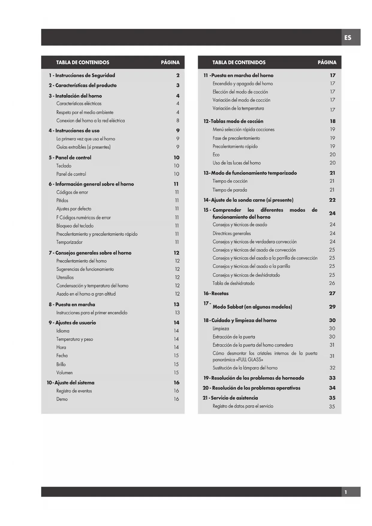 Antes de llamar al servicio verifique los siguientes puntos para evitar sobrecargarlo de forma innecesaria. Problema del horno Pasos para resolver el problema En la ventana aparece otro F_Error. Apague la corriente general y vuelva a encenderla pasados unos segundos. Si la condición persiste anote el número de código (en la lista REGISTRO EVENTO) y póngase en contacto con el servicio. El display del horno permanece en OFF Apague la corriente general (caja de fusibles o cortocircuito). Encienda el disyuntor. Si la condición persiste llame al servicio de asistencia autorizado. El ventilador de enfriamiento sigue funcionando después de haberlo apagado. El ventilador se apaga automáticamente cuando todos los componentes electrónicos se han enfriado bastante. El horno no está calentando. Verifique el disyuntor de circuito o la caja de fusibles. Asegúrese de que el horno recibe una alimentación eléctrica adecuada. Asegúrese de que se ha seleccionado la temperatura del horno. El horno no cuece de manera uniforme Consulte las tablas del horno para averiguar cuál es la posición recomendada de la rejilla. Reducir siempre la temperatura de la receta 25°F (15°C) cuando se cuece en modo horneado convección. La luz del horno no funciona correctamente Cambie o vuelva a poner la bombilla si está floja o si es defectuosa. Consulte la página 32. Procure no tocar el cristal de la bombilla con los dedos, dado que la grasa de estos puede causar que la bombilla se queme prematuramente. La luz del horno se queda encendida Verifique si la puerta del horno está obstruida Verifique si la bisagra está doblada o si se ha roto el interruptor de la puerta. El reloj y el temporizador no funcionan adecuadamente Asegúrese de que el horno recibe una alimentación eléctrica adecuada. Consulte las secciones reloj en la página 14. Exceso de humedad Caliente previamente el horno cuando use el modo horneado. El horneado y el asado de convección eliminarán toda la humedad del horno (es una de las ventajas de la convección). Esquirlas de porcelana Cuando se sacan y se cambian las rejillas del horno tire siempre de estas hacia arriba sin forzarlas para evitar que la porcelana se desmenuce.ES