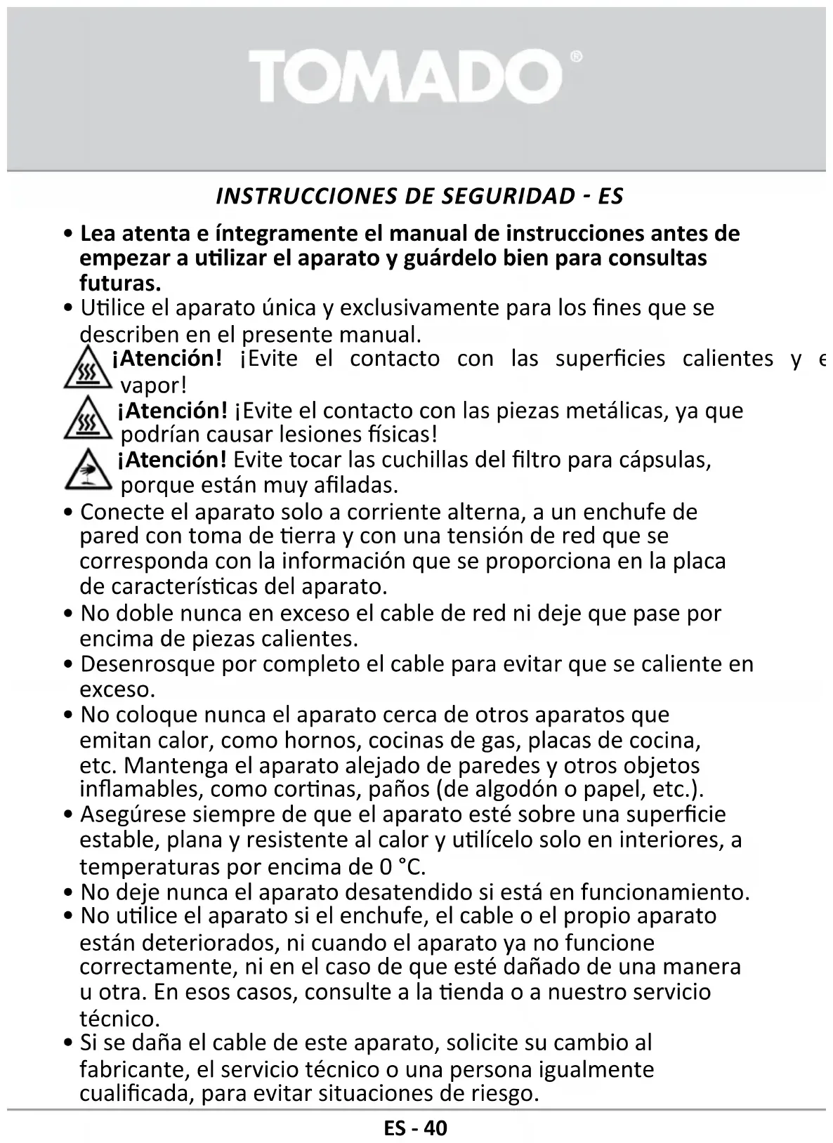 - Ulice el aparato única y exclusivamente para los nes que se describen en el presente manual. ¡Atención! ¡Evite el contacto con las supercies calientes y el vapor! ¡Atención! ¡Evite el contacto con las piezas metálicas, ya que podrían causar lesiones sicas! ¡Atención! Evite tocar las cuchillas del ltro para cápsulas, porque están muy aladas.