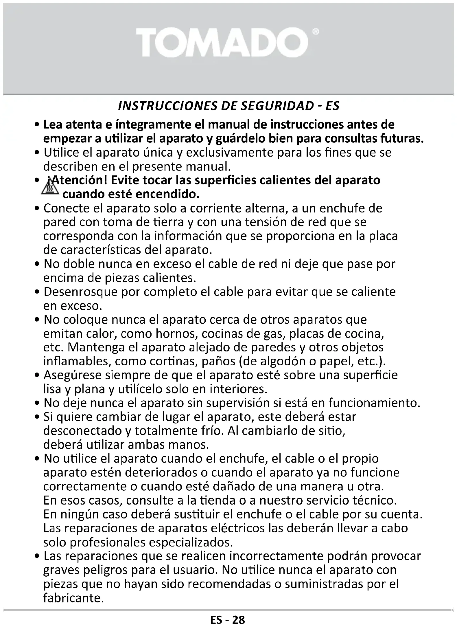 Este producto está cubierto por una garantía de 24 días. Su garantía es正版a siempre que el producto se usa conforme a las instrucciones de uso y para el fin para el que se ha concebido. Además, se deben estar presentar el justificante de comprara original, donde figure la Fecha de compra, el nombre del vendedor y el número de articulo del producto. Para leer todos los detalles de las conditiones de garantía, visite nuestro Sitio web: www.tomado.com/support