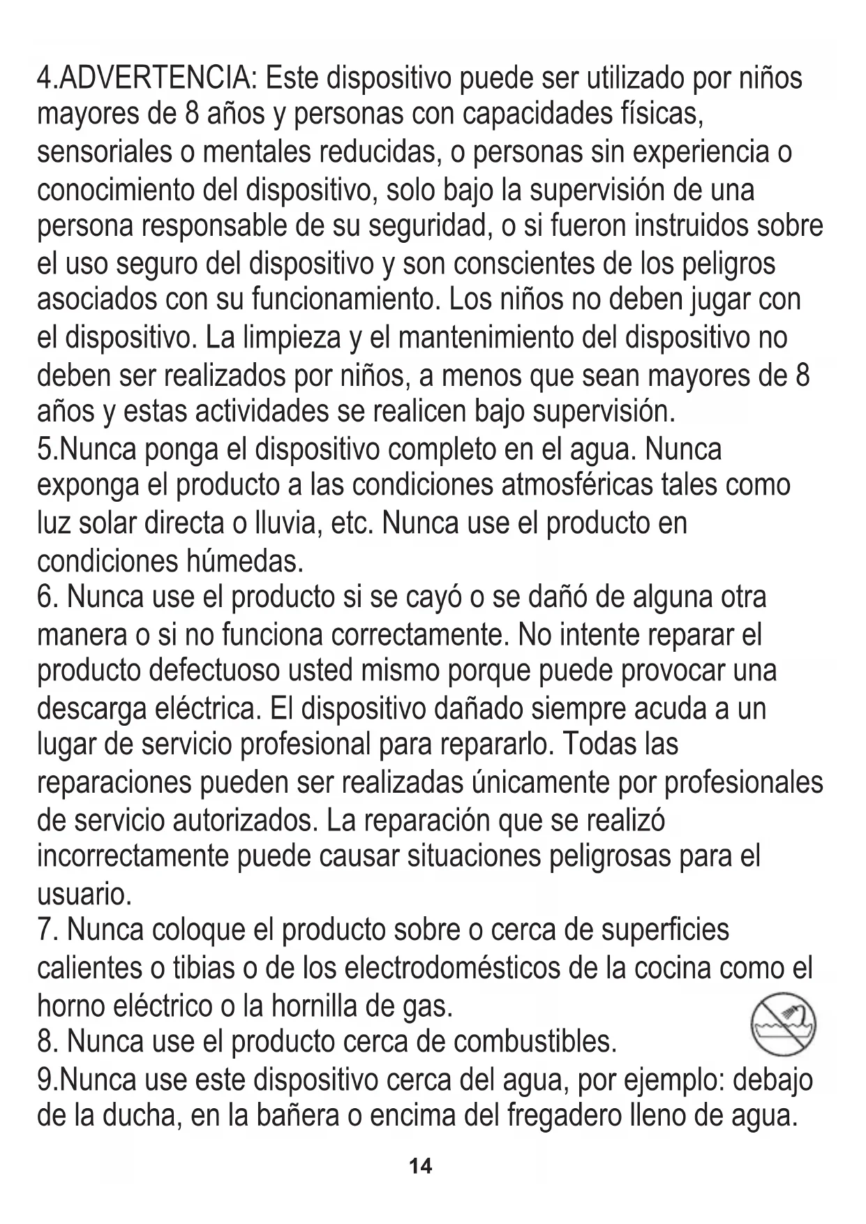 producto para ningún propósito que no sea compatible con su aplicación. El fabricante no se hace responsable de los daños debidos a un mal uso. 3.Tenga cuidado al usarlo con niños. No permita que los niños jueguen con el producto. No permita que los niños o personas que no conozcan el dispositivo lo utilicen sin supervisión.14 4.ADVERTENCIA: Este dispositivo puede ser utilizado por niños mayores de 8 años y personas con capacidades físicas, sensoriales o mentales reducidas, o personas sin experiencia o conocimiento del dispositivo, solo bajo la supervisión de una persona responsable de su seguridad, o si fueron instruidos sobre el uso seguro del dispositivo y son conscientes de los peligros asociados con su funcionamiento. Los niños no deben jugar con el dispositivo. La limpieza y el mantenimiento del dispositivo no deben ser realizados por niños, a menos que sean mayores de 8 años y estas actividades se realicen bajo supervisión. 5.Nunca ponga el dispositivo completo en el agua. Nunca exponga el producto a las condiciones atmosféricas tales como luz solar directa o lluvia, etc. Nunca use el producto en condiciones húmedas. 9.Nunca use este dispositivo cerca del agua, por ejemplo: debajo de la ducha, en la bañera o encima del fregadero lleno de agua.