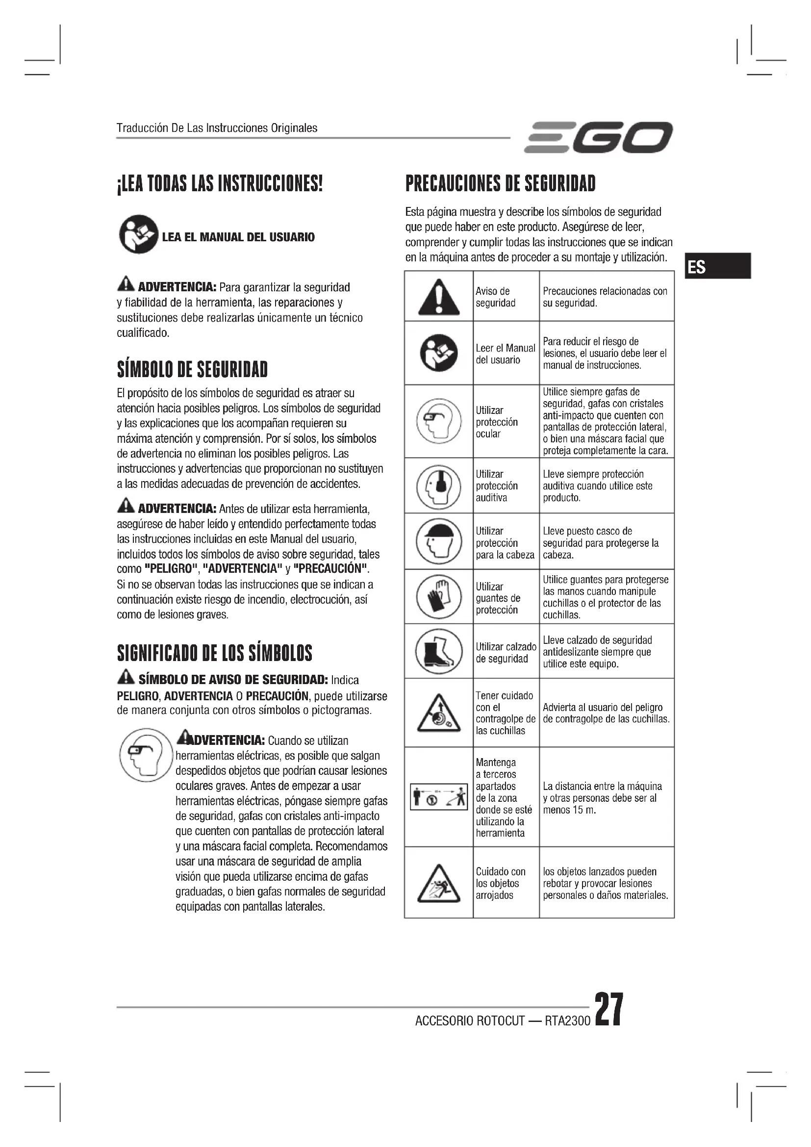 Esta página muestra y describe los símbolos de seguridad que puede haber en este producto. Asegúrese de leer, comprender y cumplir todas las instrucciones que se indican en la máquina antes de proceder a su montaje y utilización. Aviso de seguridadPrecauciones relacionadas con su seguridad.Leer el Manual del usuarioPara reducir el riesgo de lesiones, el usuario debe leer el manual de instrucciones.Utilizar protección ocularUtilice siempre gafas de seguridad, gafas con cristales anti-impacto que cuenten con pantallas de protección lateral, o bien una máscara facial que proteja completamente la cara.Utilizar protección auditivaLleve siempre protección auditiva cuando utilice este producto.Utilizar protección para la cabezaLleve puesto casco de seguridad para protegerse la cabeza.Utilizar guantes de protecciónUtilice guantes para protegerse las manos cuando manipule cuchillas o el protector de las cuchillas.Utilizar calzado de seguridadLleve calzado de seguridad antideslizante siempre que utilice este equipo.Tener cuidado con el contragolpe de las cuchillasAdvierta al usuario del peligro de contragolpe de las cuchillas.Mantenga a terceros apartados de la zona donde se esté utilizando la herramientaLa distancia entre la máquina y otras personas debe ser al menos 15m.Cuidado con los objetos arrojadoslos objetos lanzados pueden rebotar y provocar lesiones personales o daños materiales. Traducción De Las Instrucciones OriginalesACCESORIO ROTOCUT — RTA230028