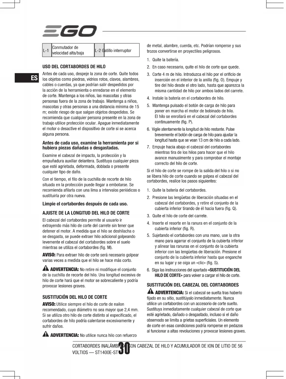 El hilo de corte no se extrae automáti-camente del cabezal del cortabordes. ◾ Hay una acumulación de hierba en el eje del motor o el cabezal del cortabordes. ◾ Apague el cortabordes, quite la batería y limpie el eje del motor y cabezal del cortabordes. ◾ No queda suficiente hilo de corte en el carrete o el hilo se rompe de la anilla. ◾ Quite la batería y sustituya el hilo de corte. Consulte el apartado «SUSTITUCIÓN DEL HILO DE CORTE» en este manual. ◾ El hilo de corte está enredado. ◾ Quite la batería y sustituya el hilo de corte. Consulte el apartado «SUSTITUCIÓN DEL HILO DE CORTE» en este manual. ◾ El hilo es demasiado corto. ◾ Quite la batería y sustituya el hilo de corte. Consulte el apartado «SUSTITUCIÓN DEL HILO DE CORTE» en este manual.Hay hierba enredada alrededor del cabezal y de la carcasa del motor.Está cortando a nivel del suelo hierba demasiado alta.Corte la hierba alta de arriba hacia abajo, cortando un máximo de 20 cm en cada pasada para evitar que se enrede.Grietas en el cabezal del cortabordes o el cartucho del carrete se suelta de la base de carrete. ◾ El cabezal del cortabordes está desgastado. ◾ Sustituya inmediatamente el cabezal del cortabordes. Consulte el apartado «SUSTITUCIÓN DEL CABEZAL DEL CORTABORDES» en este manual. ◾ La tuerca que bloquea el cabezal del cortabordes está suelta. ◾ Abra el cabezal del cortabordes y utilice una llave de impacto para apretar la tuerca.El hilo de corte no se puede enrollar correctamente en el cabezal del cortabordes. ◾ El hilo de corte es demasiado largo. ◾ Corte el hilo de modo que se vean aproximadamente a 13 cm por cada lado. ◾ Se han acumulado restos de hierba o suciedad en el cabezal del cortabordes y se ha bloqueado el movimiento de la bobina de hilo. ◾ Quite la batería, abra el cabezal del cortabordes y límpielo a fondo. ◾ El motor se ha sobrecalentado debido al funcionamiento del sistema de bobinado de hilo repetidamente. ◾ Deje que el cortabordes con cabezal de hilo funcione sin carga durante unos minutos para enfriar el motor y, a continuación, intente volver a cargar el hilo. ◾ Batería baja. ◾ Cargue la batería. El hilo de corte no se puede pasar a través del cabezal del cortabordes cuando se inserta el hilo. ◾ El hilo de corte está partido o doblado en el extremo. ◾ Corte el extremo desgastado del hilo y vuelva a insertarlo. ◾ No se ha libreado la cubierta inferior para colocarla en su posición después de volver a instalarla. ◾ Instale la batería en el cortabordes; pulse el botón de carga de hilo para iniciar brevemente la carga de potencia para liberar la cubierta inferior. GARANTÍA POLÍTICA DE GARANTÍA DE EGO Visite la página web egopowerplus.com para conocer los términos y condiciones completos de la política de garantía de EGO.ROÇADORA DE FIO SEM FIOS DE IÃO DE LÍTIO DE 56 VOLTS — ST1400E-ST 35