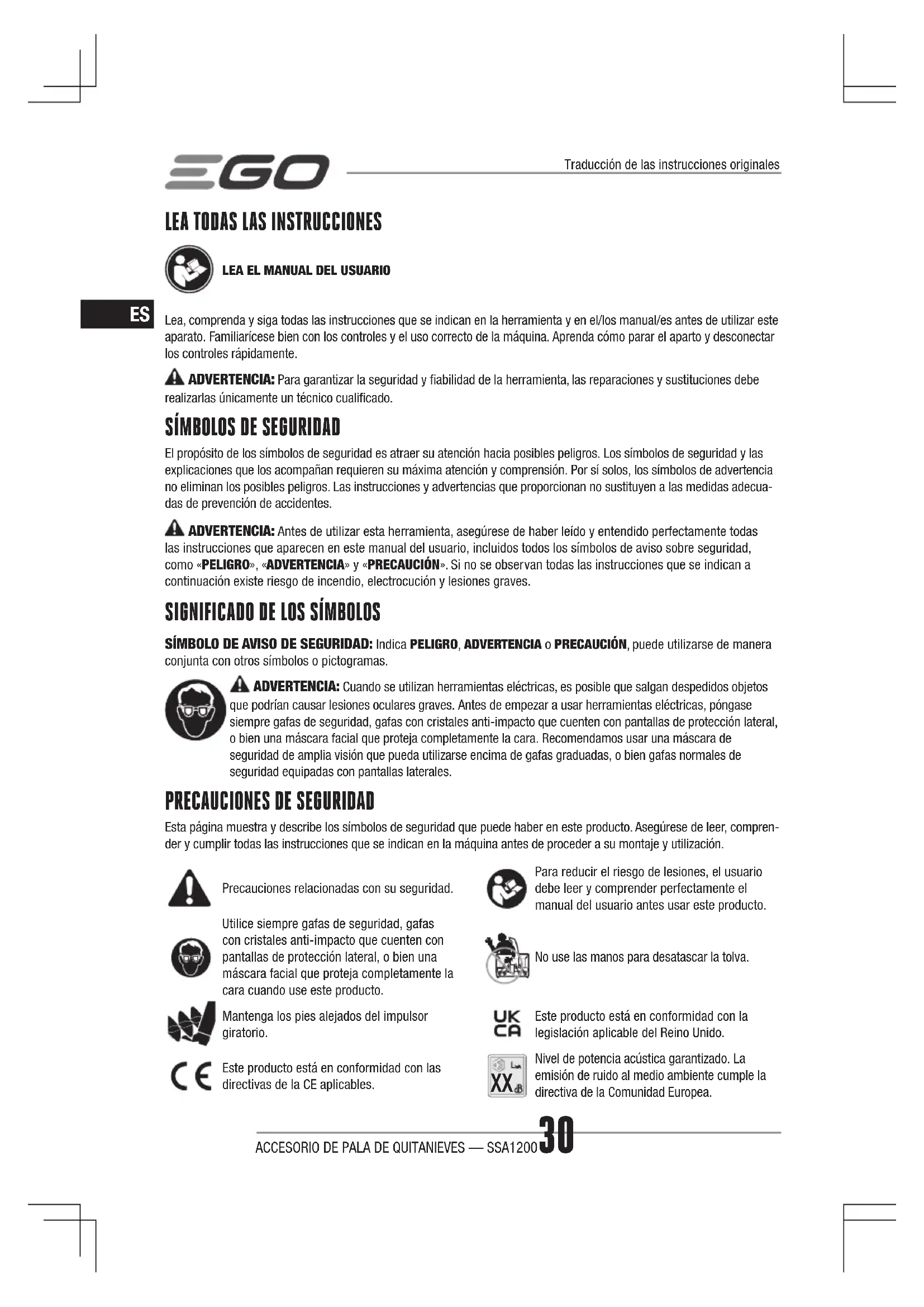 Esta página muestra y describe los símbolos de seguridad que puede haber en este producto. Asegúrese de leer, compren- der y cumplir todas las instrucciones que se indican en la máquina antes de proceder a su montaje y utilización.Precauciones relacionadas con su seguridad.Para reducir el riesgo de lesiones, el usuario debe leer y comprender perfectamente el manual del usuario antes usar este producto.Utilice siempre gafas de seguridad, gafas con cristales anti-impacto que cuenten con pantallas de protección lateral, o bien una máscara facial que proteja completamente la cara cuando use este producto.No use las manos para desatascar la tolva.Mantenga los pies alejados del impulsor giratorio.Este producto está en conformidad con la legislación aplicable del Reino Unido.Este producto está en conformidad con las directivas de la CE aplicables.