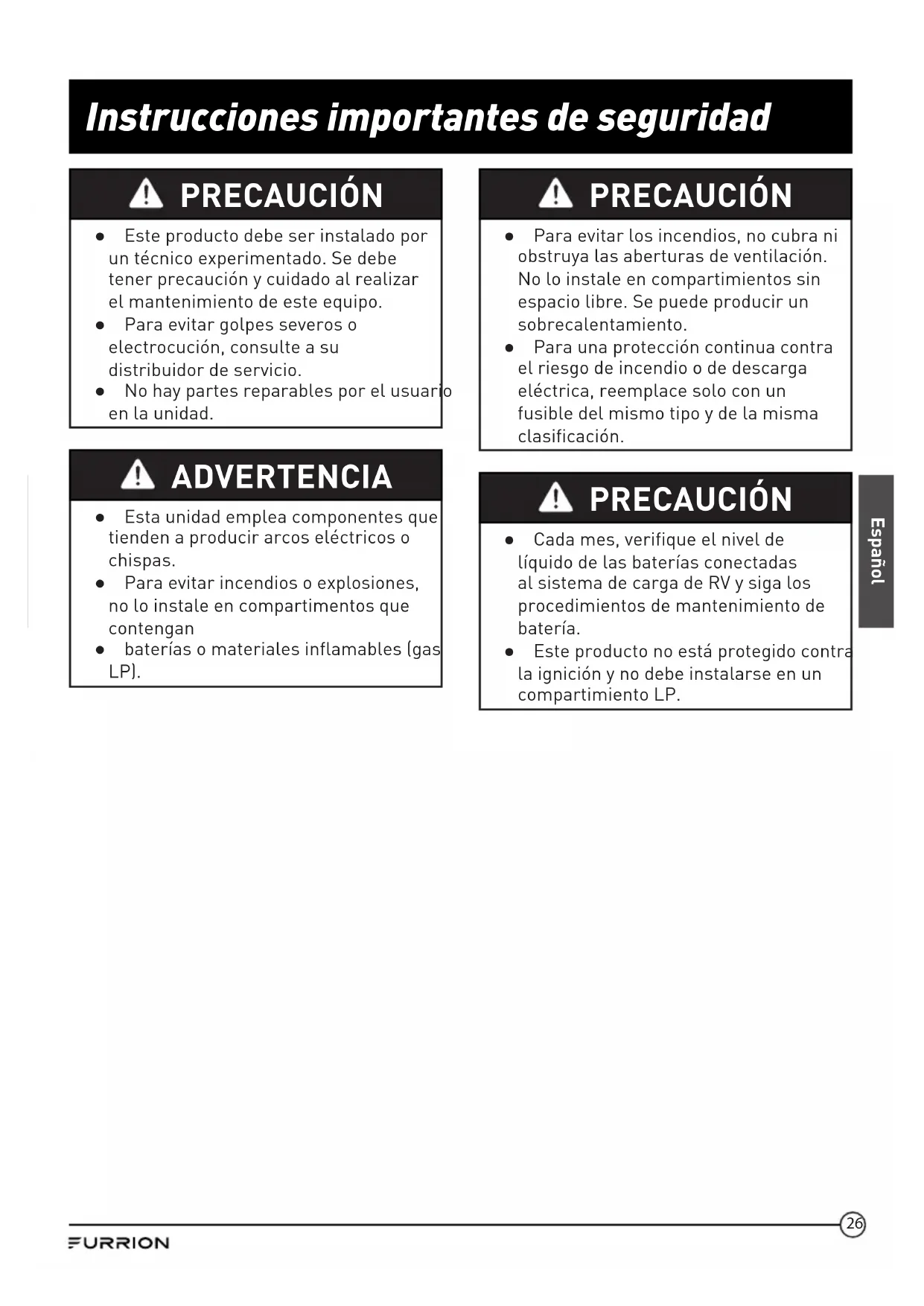 - Garantía Instrucciones importantes de seguridad Español PRECAUCIÓN ● Este producto debe ser instalado por un técnico experimentado. Se debe tener precaución y cuidado al realizar el mantenimiento de este equipo. ● Para evitar golpes severos o electrocución, consulte a su distribuidor de servicio. ● No hay partes reparables por el usuario en la unidad. ADVERTENCIA ● Esta unidad emplea componentes que tienden a producir arcos eléctricos o chispas. ● Para evitar incendios o explosiones, no lo instale en compartimentos que contengan ● baterías o materiales inflamables (gas LP). PRECAUCIÓN ● Para evitar los incendios, no cubra ni obstruya las aberturas de ventilación. No lo instale en compartimientos sin espacio libre. Se puede producir un sobrecalentamiento. ● Para una protección continua contra el riesgo de incendio o de descarga eléctrica, reemplace solo con un fusible del mismo tipo y de la misma clasificación. PRECAUCIÓN ● Cada mes, verifique el nivel de líquido de las baterías conectadas al sistema de carga de RV y siga los procedimientos de mantenimiento de batería. ● Este producto no está protegido contra la ignición y no debe instalarse en un compartimiento LP.27 Descripción del producto Español ● Panel de distribución de CA y CC con distribución máxima de 30A/12V 15CC y 12 circuitos de derivación de CA. ● Instalación y extracción sencilla del alivio de tensión del cable de CA. ● Diseño minimalista simple. ● Se puede usar con el convertidor de la serie Furrion FCVSDC60A/FCVSDC80A 12V. ● Invertir la protección de polaridad por fusible. Vista trasera Vista frontal Interruptor automático Cubierta Salida CC28 Instalación Español Este producto no está protegido contra la ignición y no debe instalarse en un compartimiento LP. Para obtener los tamaños de cable y los requisitos de par adecuados, consulte la etiqueta en la parte posterior del conjunto de la puerta. ADVERTENCIA Esta unidad emplea componentes que tienden a producir arcos eléctricos o chispas. Para evitar incendios o explosiones, no lo instale en compartimentos que contengan baterías o materiales inflamables (gas LP). PRECAUCIÓN ● Para evitar los incendios, no cubra ni obstruya las aberturas de ventilación. No lo instale en compartimientos sin espacio libre. Se puede producir un sobrecalentamiento. ● Para una protección continua contra el riesgo de incendio o de descarga eléctrica, reemplace solo con un fusible del mismo tipo y de la misma clasificación. Contenidos de la caja Asegúrese de tener todos los siguientes elementos incluidos en el embalaje. Si algún artículo está dañado o falta, contacte a su distribuidor. − Panel de distribución x 1 − Manual de instrucciones x 1 − Tarjeta de garantía x 1 Montaje del panel de distribución Consulte a un electricista con licencia o un técnico de RV para asistencia en la instalación. p. 3626