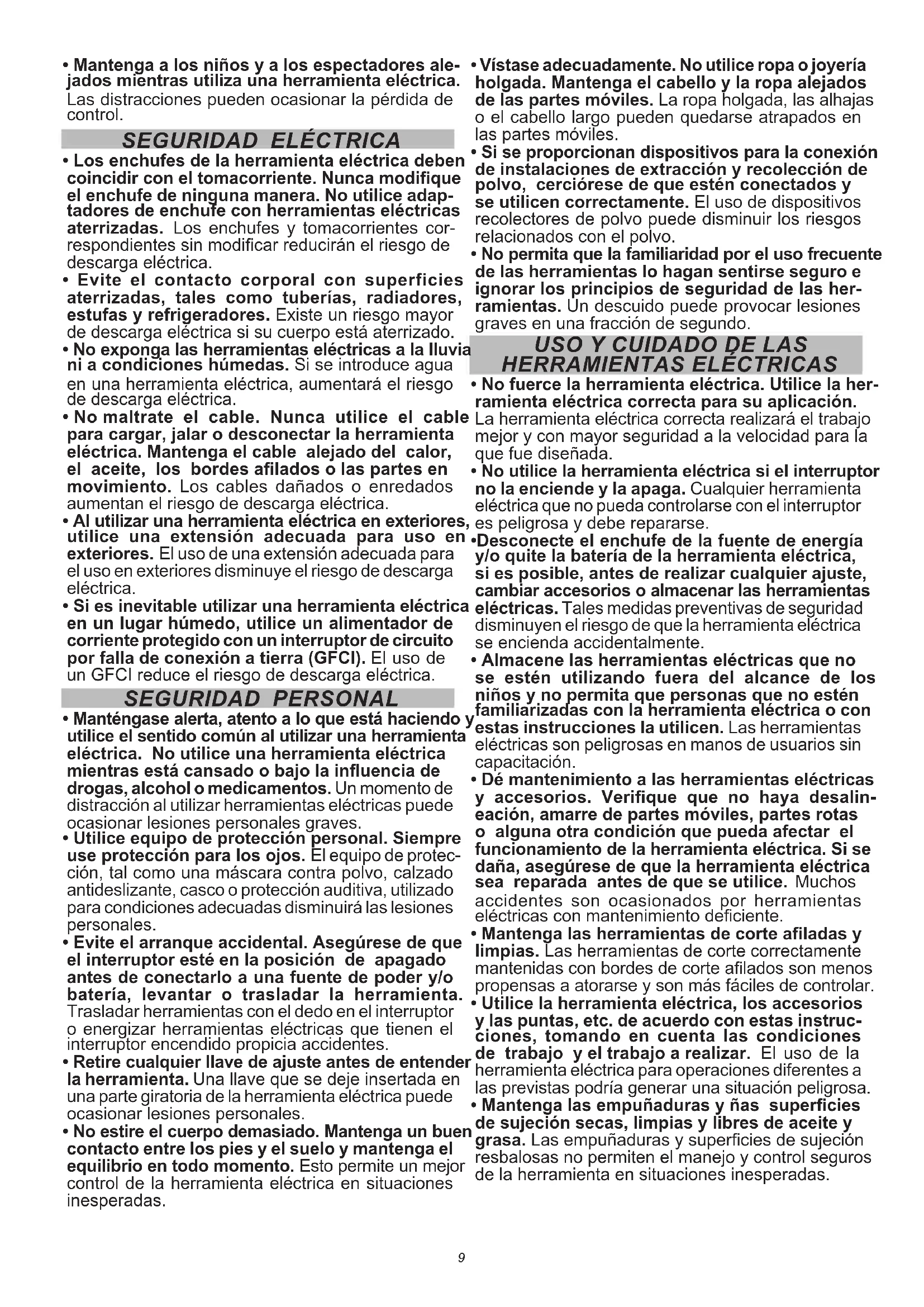 - No utilice herramientas eléctricas en atmósferas explosivas, tales como en presencia de líquidos, gases o polvos inamables. Las herramientas eléctricas generan chispas que pueden encender el polvo o los vapores.9