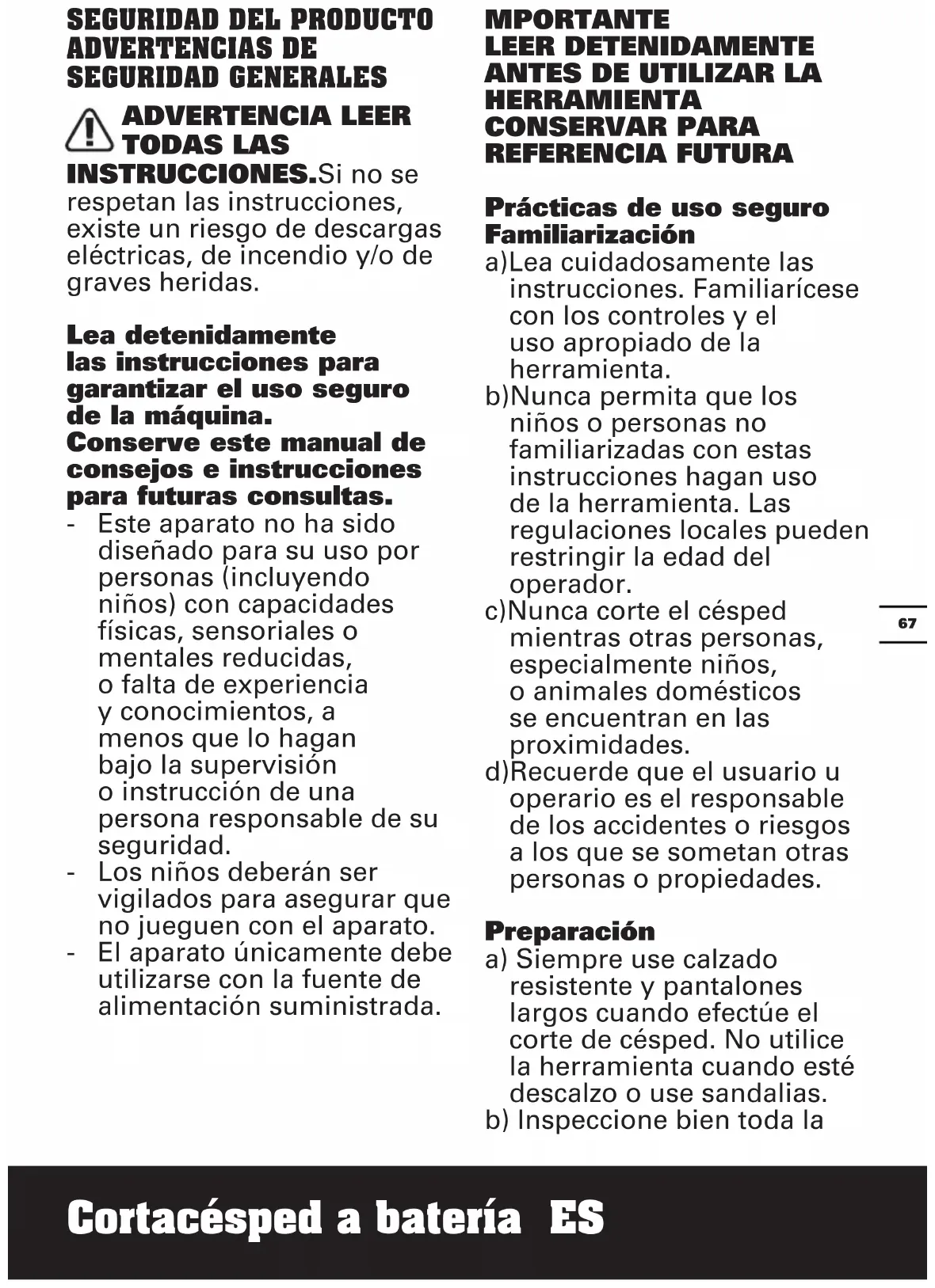 HERRAMIENTA CONSERVAR PARA REFERENCIA FUTURA Prácticas de uso seguro Familiarización a)Lea cuidadosamente las instrucciones. Familiarícese con los controles y el uso apropiado de la herramienta. b)Nunca permita que los niños o personas no familiarizadas con estas instrucciones hagan uso de la herramienta. Las regulaciones locales pueden restringir la edad del operador. c)Nunca corte el césped mientras otras personas, especialmente niños, o animales domésticos se encuentran en las proximidades. d)Recuerde que el usuario u operario es el responsable de los accidentes o riesgos a los que se sometan otras personas o propiedades. Preparación a) Siempre use calzado resistente y pantalones largos cuando efectúe el corte de césped. No utilice la herramienta cuando esté descalzo o use sandalias. b) Inspeccione bien toda la6968 Cortacésped a batería ES zona en la que desee utilizar el equipo, y retire todos los objetos que pudieran ser lanzados por la máquina; c) Antes del uso, siempre examine visualmente la herramienta a fin de comprobar que las cuchillas, los pernos de las cuchillas y la unidad de corte no estén desgastados o dañados. A fin de evitar posibles desequilibrios, las cuchillas y los pernos desgastados o dañados deben ser reemplazados por juegos completos; Sustituya las etiquetas dañadas o ilegibles. Funcionamiento a) Trabaje únicamente de día o con buena luz artificial. b) Cuando sea posible, evite manejar la herramienta sobre césped mojado. c) Asegúrese de no perder el equilibrio en las pendientes. d) Camine, no corra; e) En máquinas giratorias con ruedas, corte en dirección perpendicular a la pendiente, nunca hacia arriba y hacia abajo; f) Observe extrema precaución al cambiar de dirección en las pendientes. g) No trabaje sobre pendientes excesivamente empinadas. h) Tenga mucho cuidado al invertir la marcha de la herramienta o al desplazarla hacia Ud.