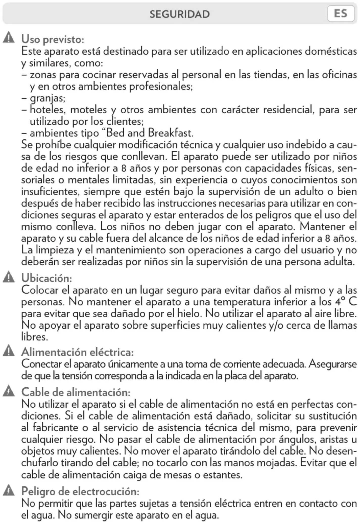 Este aparato está destinado para ser utilizado en aplicaciones domésticas y similares, como: – zonas para cocinar reservadas al personal en las tiendas, en las oficinas y en otros ambientes profesionales; – granjas; – hoteles, moteles y otros ambientes con carácter residencial, para ser utilizado por los clientes; – ambientes tipo “Bed and Breakfast. Se prohíbe cualquier modificación técnica y cualquier uso indebido a cau- sa de los riesgos que conllevan. El aparato puede ser utilizado por niños de edad no inferior a 8 años y por personas con capacidades físicas, sen- soriales o mentales limitadas, sin experiencia o cuyos conocimientos son insuficientes, siempre que estén bajo la supervisión de un adulto o bien después de haber recibido las instrucciones necesarias para utilizar en con- diciones seguras el aparato y estar enterados de los peligros que el uso del mismo conlleva. Los niños no deben jugar con el aparato. Mantener el aparato y su cable fuera del alcance de los niños de edad inferior a 8 años. La limpieza y el mantenimiento son operaciones a cargo del usuario y no deberán ser realizadas por niños sin la supervisión de una persona adulta. Ubicación