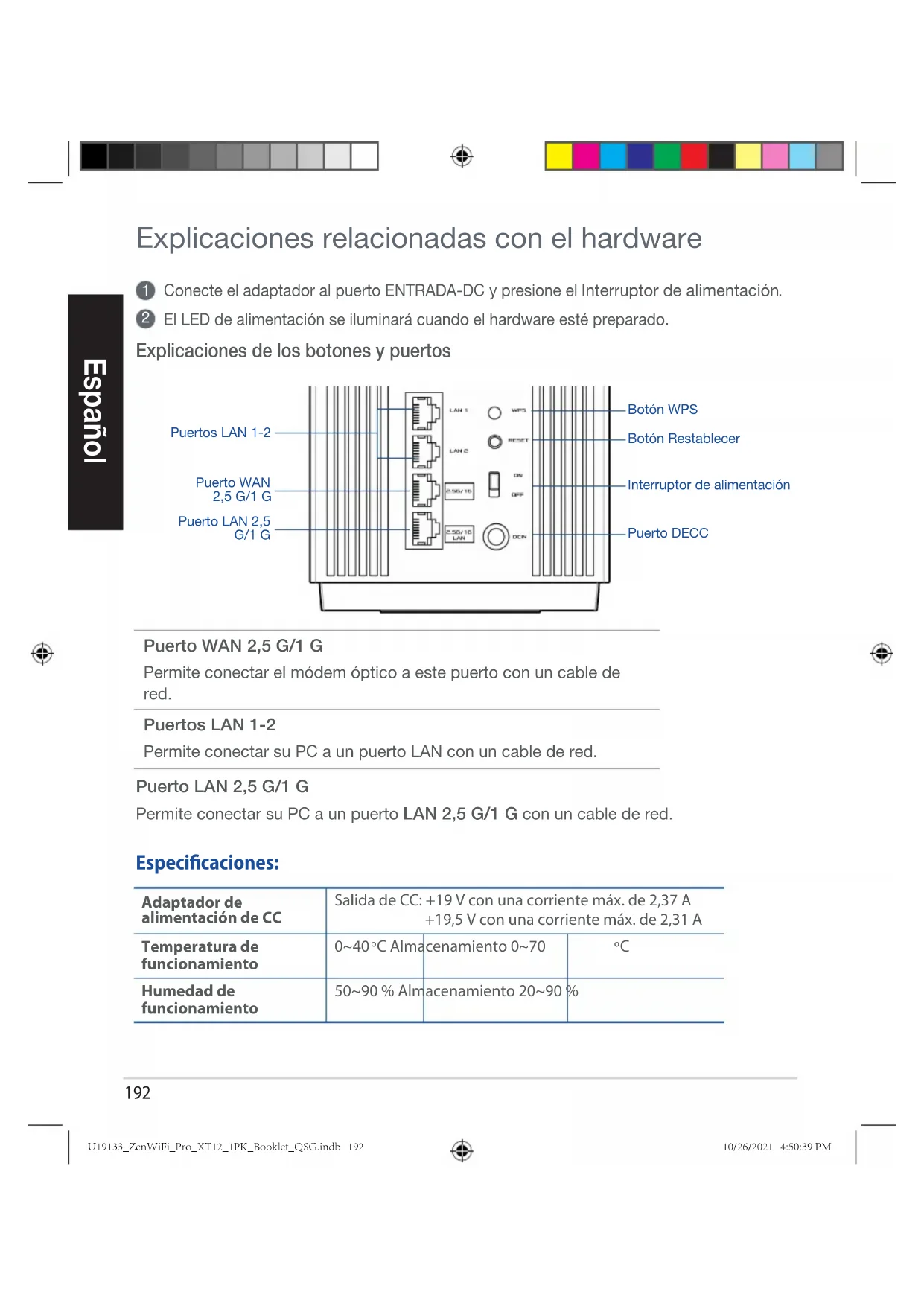 El LED de alimentación se iluminará cuando el hardware esté preparado. Explicaciones relacionadas con el hardware Explicaciones de los botones y puertos Puerto WAN 2,5 G/1 G Permite conectar el módem óptico a este puerto con un cable de red. Puertos LAN 1-2 Permite conectar su PC a un puerto LAN con un cable de red.Adaptador de alimentación de CCSalida de CC: +19 V con una corriente máx. de 2,37 A +19,5 V con una corriente máx. de 2,31 ATemperatura de funcionamiento0~40 C Almacenamiento 0~70