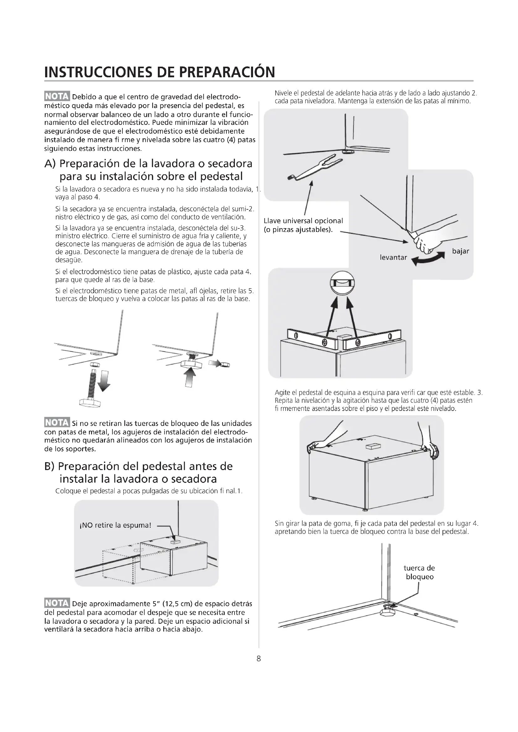 B) Preparación del pedestal antes de instalar la lavadora o secadora