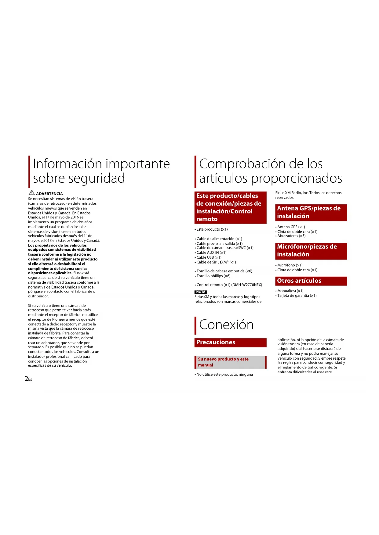 - Este producto (×1)• Cable de alimentación (×1)• Cable previo a la salida (×1)• Cable de cámara trasera/SWC (×1)• Cable AUX IN (×1)• Cable USB (×1)• Cable de SiriusXM® (×1)• Tornillo de cabeza embutida (×6)• Tornillo phillips (×6)• Control remoto (×1) (DMH-W2770NEX) NOTA SiriusXM y todas las marcas y logotipos relacionados son marcas comerciales de Sirius XM Radio, Inc. Todos los derechos reservados.• Antena GPS (×1)• Cinta de doble cara (×1)• Abrazaderas (×3)• Micrófono (×1)• Cinta de doble cara (×1)• Manual(es) (×1)• Tarjeta de garantía (×1)• No utilice este producto, ninguna aplicación, ni la opción de la cámara de visión trasera (en caso de haberla adquirido) si al hacerlo se distraerá de alguna forma y no podrá manejar su vehículo con seguridad. Siempre respete las reglas para conducir con seguridad y el reglamento de tráfico vigente. Si enfrenta dificultades al usar este Comprobación de los artículos proporcionados Este producto/cables de conexión/piezas de instalación/Control remoto Antena GPS/piezas de instalación Micrófono/piezas de instalación Otros artículos Conexión Precauciones Su nuevo producto y este manual3Es Español producto, deténgase, estacione su vehículo en un lugar seguro y accione el freno de mano antes de realizar los ajustes necesarios.