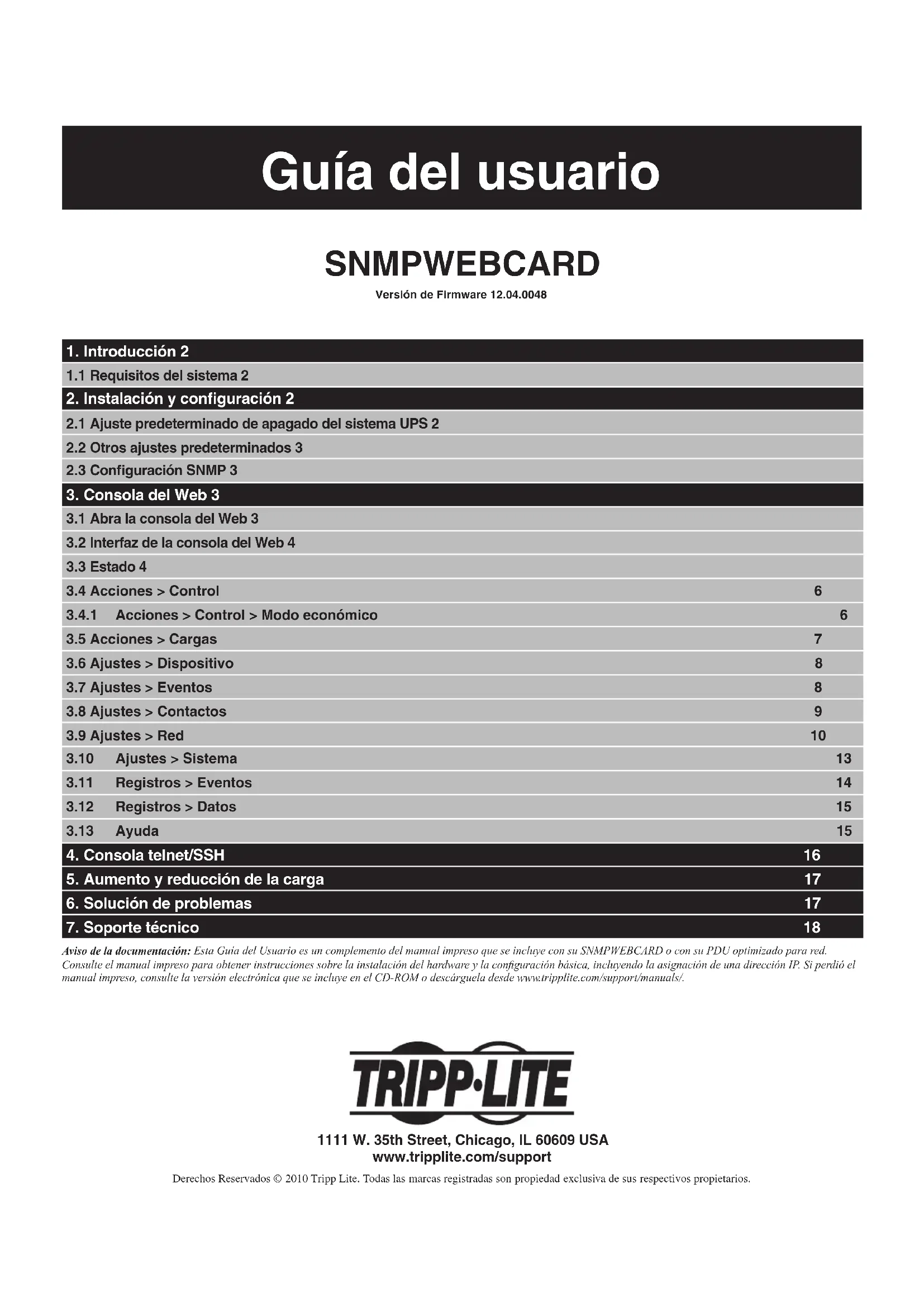 Aviso de la documentación: Esta Guía del Usuario es un complemento del manual impreso que se incluye con su SNMPWEBCARD o con su PDU optimizado para red. Consulte el manual impreso para obtener instrucciones sobre la instalación del hardware y la conguración básica, incluyendo la asignación de una dirección IP. Si perdió el manual impreso, consulte la versión electrónica que se incluye en el CD-ROM o descárguela desde www.tripplite.com/support/manuals/.2