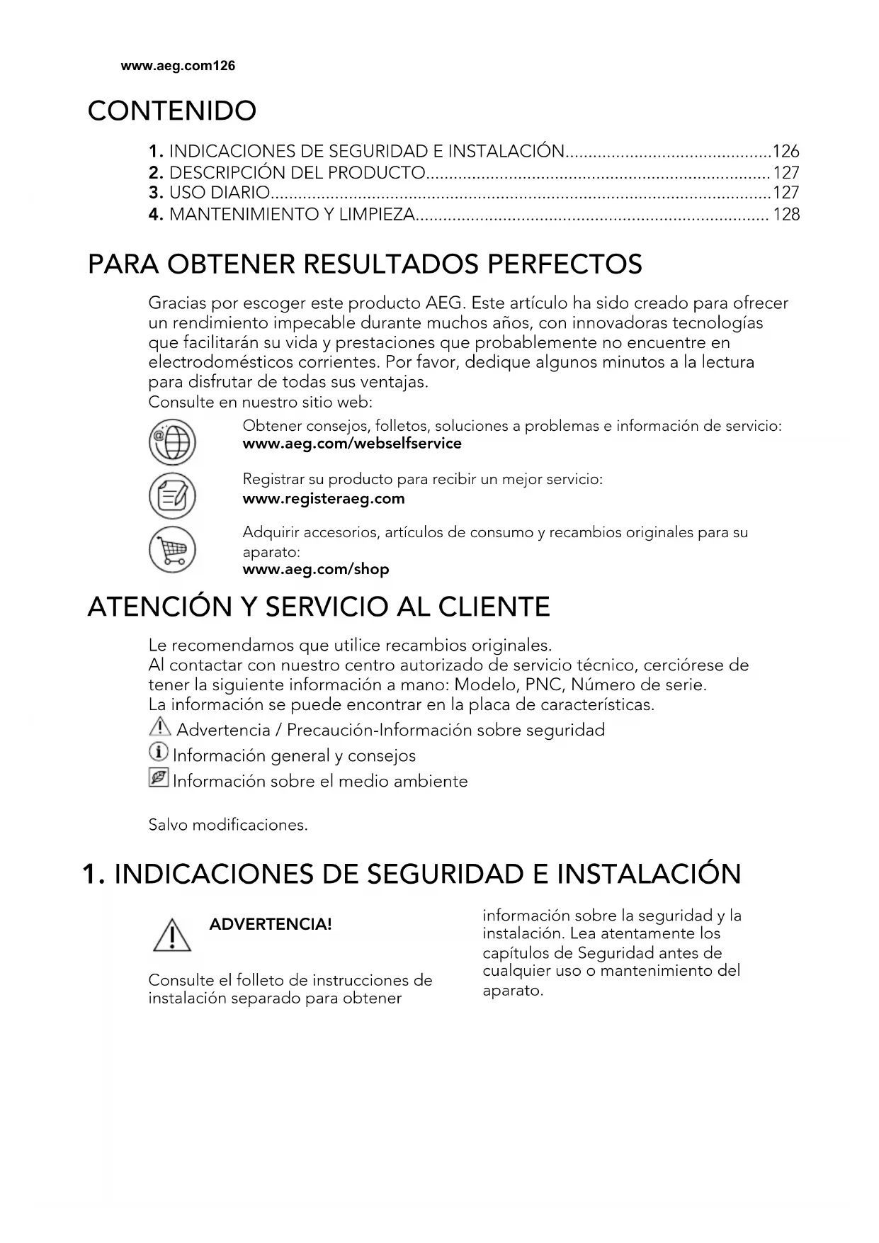 Gracias por escoger este producto AEG. Este artículo ha sido creado para ofrecer un rendimiento impecable durante muchos años, con innovadoras tecnologías que facilitarán su vida y prestaciones que probablemente no encuentre en electrodomésticos corrientes. Por favor, dedique algunos minutos a la lectura para disfrutar de todas sus ventajas. Consulte en nuestro sitio web: Obtener consejos, folletos, soluciones a problemas e información de servicio: www.aeg.com/webselfservice Registrar su producto para recibir un mejor servicio: www.registeraeg.com Adquirir accesorios, artículos de consumo y recambios originales para su aparato: www.aeg.com/shop