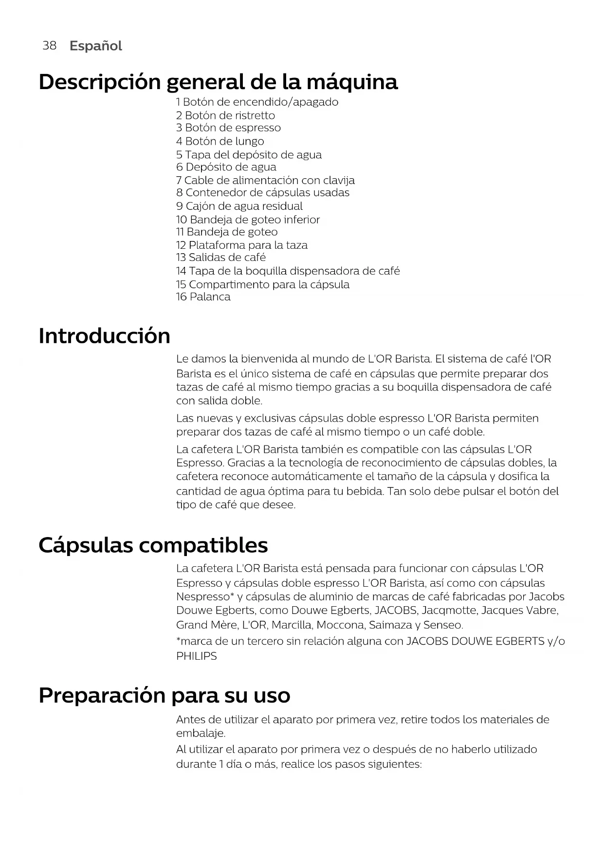 DeutschEspañol Descripción general de la máquina 1 Botón de encendido/apagado 2 Botón de ristretto 3 Botón de espresso 4 Botón de lungo 5 Tapa del depósito de agua 6 Depósito de agua 7 Cable de alimentación con clavija 8 Contenedor de cápsulas usadas 9 Cajón de agua residual 10 Bandeja de goteo inferior 11 Bandeja de goteo 12 Plataforma para la taza 13 Salidas de café 14 Tapa de la boquilla dispensadora de café 15 Compartimento para la cápsula 16 Palanca Introducción Le damos la bienvenida al mundo de L'OR Barista. El sistema de café l'OR Barista es el único sistema de café en cápsulas que permite preparar dos tazas de café al mismo tiempo gracias a su boquilla dispensadora de café con salida doble. Las nuevas y exclusivas cápsulas doble espresso L'OR Barista permiten preparar dos tazas de café al mismo tiempo o un café doble. La cafetera L'OR Barista también es compatible con las cápsulas L'OR Espresso. Gracias a la tecnología de reconocimiento de cápsulas dobles, la cafetera reconoce automáticamente el tamaño de la cápsula y dosifica la cantidad de agua óptima para tu bebida. Tan solo debe pulsar el botón del tipo de café que desee. Cápsulas compatibles La cafetera L'OR Barista está pensada para funcionar con cápsulas L'OR Espresso y cápsulas doble espresso L'OR Barista, así como con cápsulas Nespresso* y cápsulas de aluminio de marcas de café fabricadas por Jacobs Douwe Egberts, como Douwe Egberts, JACOBS, Jacqmotte, Jacques Vabre, Grand Mère, L'OR, Marcilla, Moccona, Saimaza y Senseo. *marca de un tercero sin relación alguna con JACOBS DOUWE EGBERTS y/o PHILIPS Preparación para su uso Antes de utilizar el aparato por primera vez, retire todos los materiales de embalaje. Al utilizar el aparato por primera vez o después de no haberlo utilizado durante 1día o más, realice los pasos siguientes: