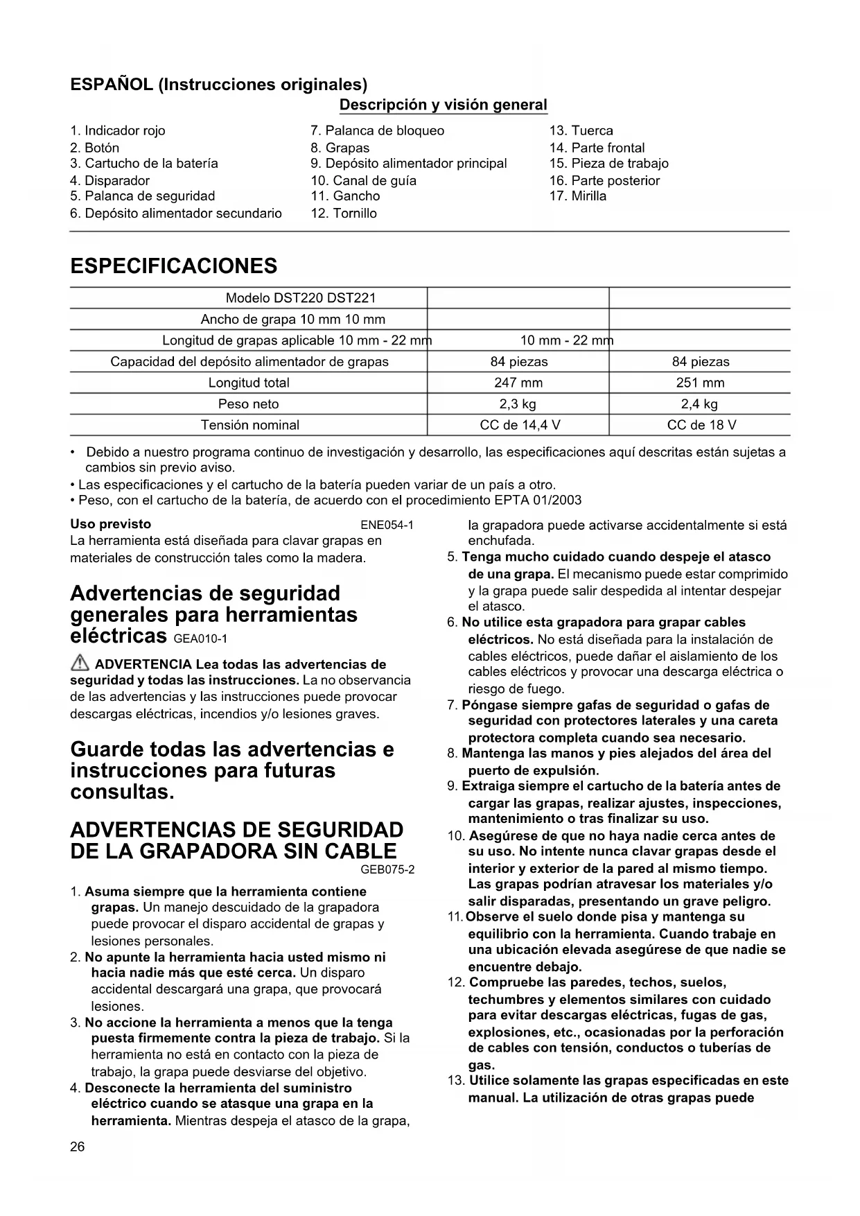 - Peso, con el cartucho de la batería, de acuerdo con el procedimiento EPTA 01/2003 Uso previsto ENE054-1 La herramienta está diseñada para clavar grapas en materiales de construcción tales como la madera. Advertencias de seguridad generales para herramientas eléctricas GEA010-1 ADVERTENCIA Lea todas las advertencias de seguridad y todas las instrucciones. La no observancia de las advertencias y las instrucciones puede provocar descargas eléctricas, incendios y/o lesiones graves. Guarde todas las advertencias e instrucciones para futuras consultas.