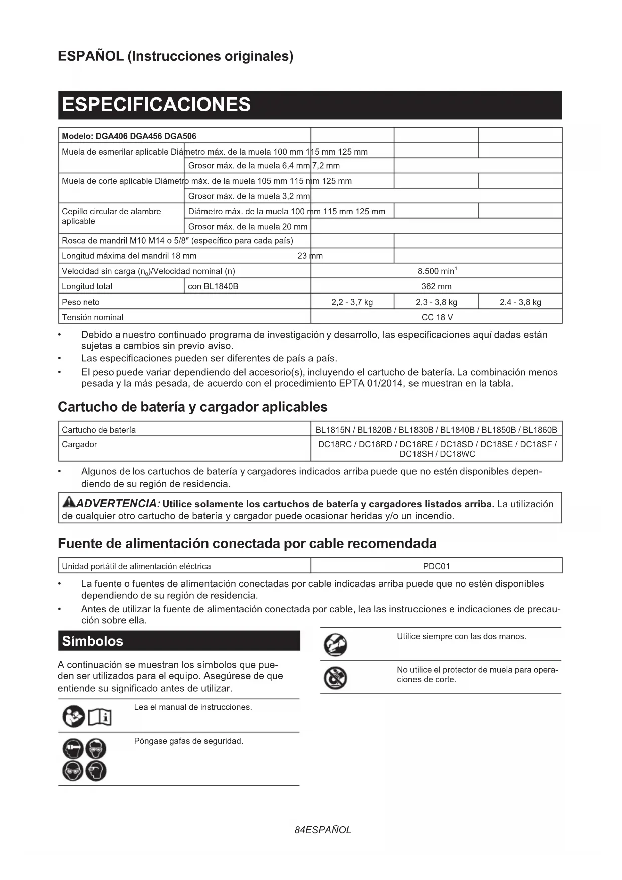 - Antes de utilizar la fuente de alimentación conectada por cable, lea las instrucciones e indicaciones de precau- ción sobre ella. Símbolos A continuación se muestran los símbolos que pue- den ser utilizados para el equipo. Asegúrese de que entiende su signicado antes de utilizar. Lea el manual de instrucciones. Póngase gafas de seguridad. Utilice siempre con las dos manos. No utilice el protector de muela para opera- ciones de corte.85 ESPAÑOL Ni-MH Li-ion Sólo para países de la Unión Europea Debido a la presencia de componentes peligrosos en el equipo, el equipo eléctrico y electrónico, los acumuladores y las baterías desechados pueden tener un impacto negativo para el medioambiente y la salud humana. ¡No tire los aparatos eléctricos y electrónicos ni las baterías junto con los residuos domésticos! De conformidad con las Directivas Europeas sobre residuos de aparatos eléctricos y electrónicos y sobre acumu- ladores y baterías y residuos de acumula- dores y baterías, así como la adaptación de las mismas a la ley nacional, el equipo eléctrico, las baterías y los acumuladores desechados deberán ser almacenados por separado y trasladados a un punto distinto de recogida de desechos municipales, que cumpla con los reglamentos sobre protec- ción medioambiental. Esto se indica mediante el símbolo de cubo de basura tachado colocado en el equipo. Uso previsto La herramienta ha sido prevista para esmerilar, lijar, cepillar con alambres, hacer agujeros y cortar materia- les de metal y piedra sin utilizar agua. Ruido El nivel de ruido A-ponderado típico determinado de acuerdo con la norma EN62841-2-3: Modelo Nivel de presión del sonido (L