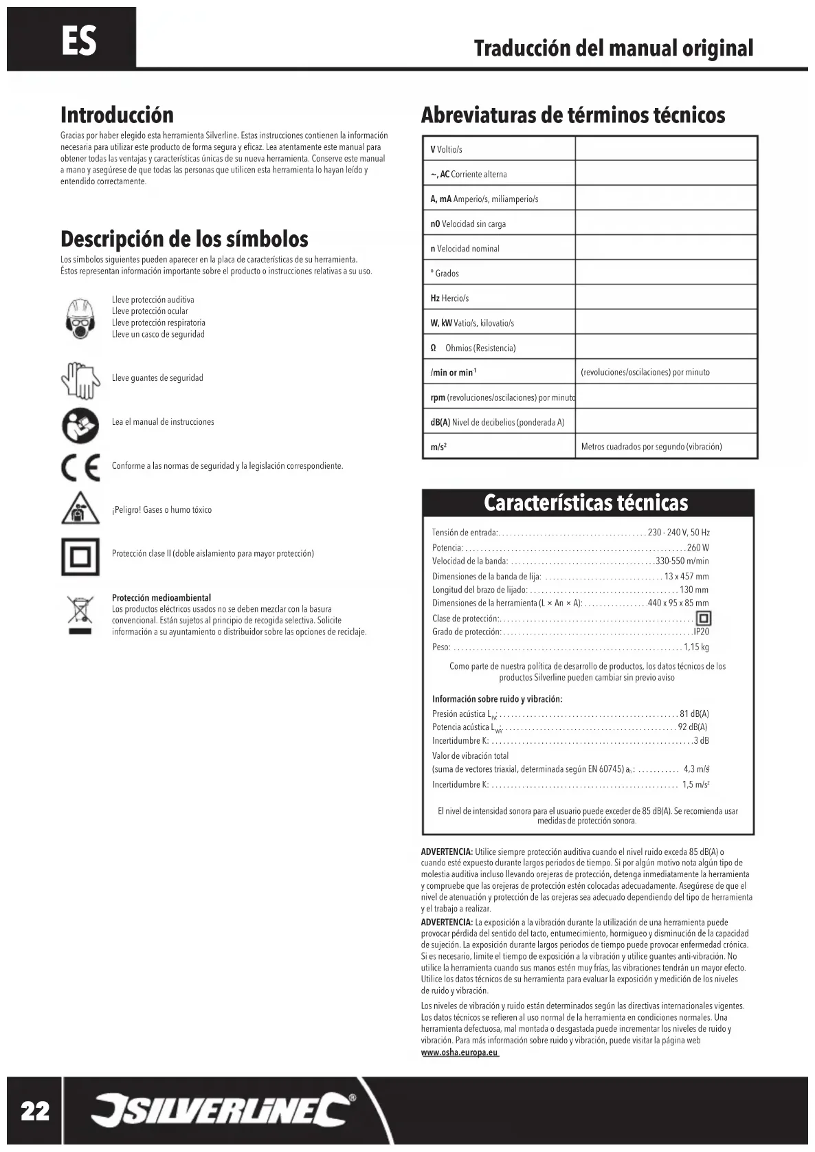 Tensión de entrada:.......................................230 - 240 V, 50 Hz Potencia: . . . . . . . . . . . . . . . . . . . . . . . . . . . . . . . . . . . . . . . . . . . . . . . . . . . . . . . . . . 260 W Velocidad de la banda: ......................................330-550 m/min Dimensiones de la banda de lija: ...............................13 x 457 mmLongitud del brazo de lijado: .......................................130 mmDimensiones de la herramienta (L × An × A): . . . . . . . . . . . . . . . . .440 x 95 x 85 mmClase de protección:................................................... Grado de protección:..................................................IP20 Peso: ............................................................1,15 kgComopartedenuestrapolíticadedesarrollodeproductos,losdatostécnicosdelosproductos Silverline pueden cambiar sin previo avisoInformación sobre ruido y vibración:Presión acústica L : ...............................................81 dB(A)Potencia acústica L :..............................................92 dB(A) Incertidumbre K: .....................................................3 dB Valor de vibración total (suma de vectores triaxial, determinada según EN 60745) a : ........... 4,3 m/s Incertidumbre K: ................................................. 1,5 m/s El nivel de intensidad sonora para el usuario puede exceder de 85 dB(A). Se recomienda usar medidas de protección sonora. Características técnicas 247820/976084_Manual.indd 22 28/06/2019 09:12Lijadora de banda 13 mm, 260 W