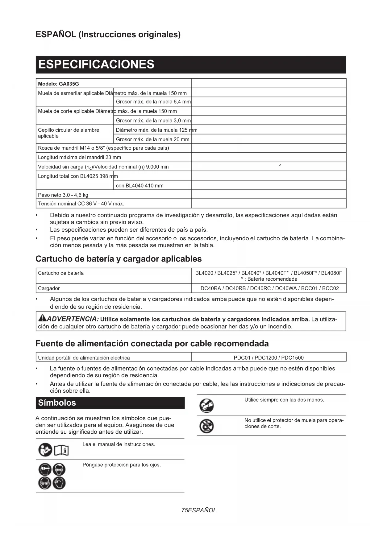 ) : (dB (A)) Incertidumbre (K) : (dB (A)) GA035G 85 93 3 NOTA: El valor (o los valores) de emisión de ruido declarado ha sido medido de acuerdo con un método de prueba estándar y se puede utilizar para comparar una herramienta con otra. NOTA: El valor (o valores) de emisión de ruido declarado también se puede utilizar en una valoración preliminar de exposición. ADVERTENCIA: Póngase protectores para oídos. ADVERTENCIA: La emisión de ruido durante la utilización real de la herramienta eléctrica puede variar del valor (o los valores) de emisión declarado dependiendo de las formas en las que la herramienta sea utilizada, especialmente qué tipo de pieza de trabajo se procesa. ADVERTENCIA: Asegúrese de identicar medidas de seguridad para proteger al operario que estén basadas en una estimación de la exposición en las condiciones reales de utilización (teniendo en cuenta todas las partes del ciclo operativo como las veces cuando la herramienta está apagada y cuando está funcionando en vacío además del tiempo de gatillo). ADVERTENCIA: Esmerilar láminas nas de metal u otras estructuras que vibren fácilmente y su supercie sea grande podrá resultar en una emisión total de ruido mucho más alta (hasta 15 dB) que los valores de emisión de ruido declarados. Emplee almohadillas de amortiguación exibles y gruesas o similares para esas piezas de trabajo para evitar que emitan sonido. Tenga en cuenta el incremento de emisión de ruido tanto al valorar el riesgo de la exposición al ruido como al seleccionar la protección adecuada para los oídos. Vibración El valor total de la vibración (suma de vectores triaxiales) determinado de acuerdo con la norma EN62841-2-3: Modo de tarea: esmerilado supercial con empuñadura lateral normal Modelo Emisión de vibración (a