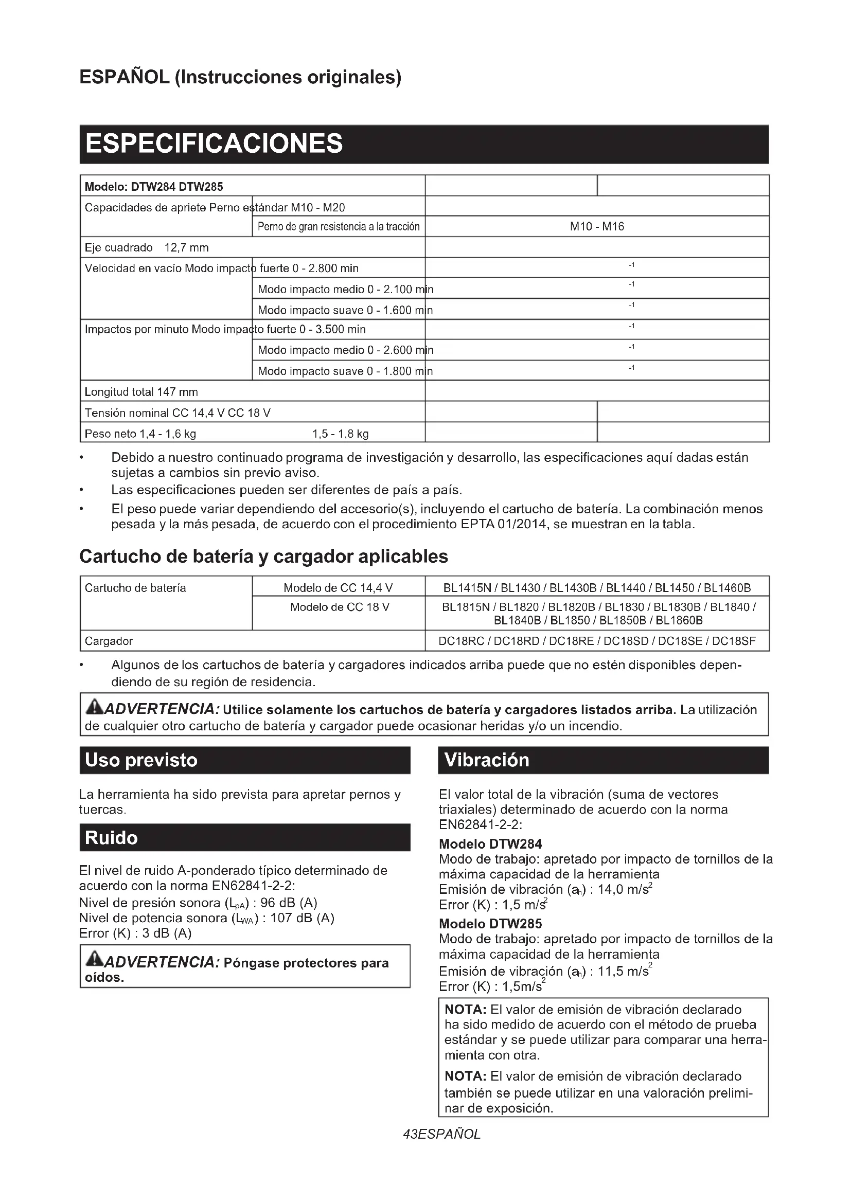 - BateríaycargadorgenuinosdeMakita NOTA: Algunos elementos de la lista podrán estar incluidos en el paquete de la herramienta como acce- sorios estándar. Pueden variar de un país a otro.51 PORTUGUÊS PORTUGUÊS (Instruções originais) ESPECIFICAÇÕES Modelo: DTW284 DTW285 Capacidades de aperto Perno normal M10 - M20 Perno de grande elasticidade M10 - M16 Cabeça quadrada de acionamento 12,7 mm Velocidadeemvazio Modo de impacto forte 0 - 2.800 min