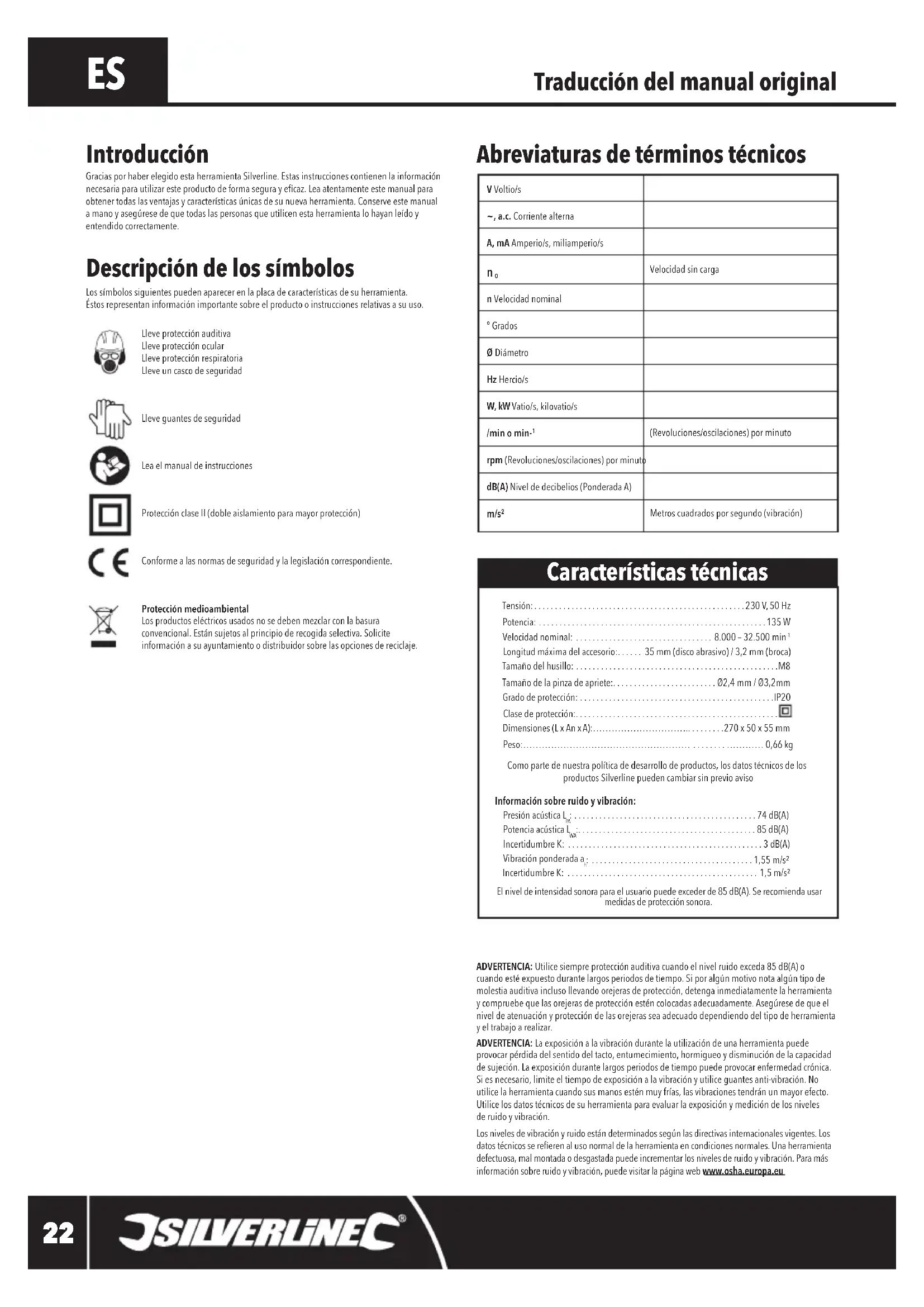 Longitudmáximadelaccesorio:......35mm(discoabrasivo)/3,2mm(broca) Tamañodelhusillo: .................................................M8 Tamañodelapinzadeapriete:.........................Ø2,4 mm / Ø3,2mm Gradodeprotección: ...............................................IP20 Clasedeprotección:................................................. Dimensiones(LxAnxA):…………………………..........270 x 50 x 55 mm Peso:……………………………………………… ........…………0,66kgComopartedenuestrapolíticadedesarrollodeproductos,losdatostécnicosdelosproductosSilverlinepuedencambiarsinprevioaviso Información sobre ruido y vibración: PresiónacústicaL : ............................................74dB(A) PotenciaacústicaL :...........................................85dB(A) IncertidumbreK: ...............................................3dB(A) Vibraciónponderadaa : .......................................1,55 m/s² IncertidumbreK: ..............................................1,5 m/s² Elniveldeintensidadsonoraparaelusuariopuedeexcederde85dB(A).Serecomiendausarmedidasdeprotecciónsonora. Introducción GraciasporhaberelegidoestaherramientaSilverline.Estasinstruccionescontienenlainformaciónnecesariaparautilizaresteproductodeformasegurayecaz.Leaatentamenteestemanualparaobtenertodaslasventajasycaracterísticasúnicasdesunuevaherramienta.Conserveestemanualamanoyasegúresedequetodaslaspersonasqueutilicenestaherramientalohayanleídoyentendidocorrectamente. Características técnicas Descripción de los símbolos Lossímbolossiguientespuedenaparecerenlaplacadecaracterísticasdesuherramienta.Éstosrepresentaninformaciónimportantesobreelproductooinstruccionesrelativasasuuso.LleveprotecciónauditivaLleveprotecciónocularLleveprotecciónrespiratoriaLleveuncascodeseguridadLleveguantesdeseguridadLeaelmanualdeinstruccionesProtecciónclaseII(dobleaislamientoparamayorprotección)Conformealasnormasdeseguridadylalegislacióncorrespondiente.Protección medioambiental Losproductoseléctricosusadosnosedebenmezclarconlabasuraconvencional.Estánsujetosalprincipioderecogidaselectiva.Soliciteinformaciónasuayuntamientoodistribuidorsobrelasopcionesdereciclaje.V Voltio/s~, a.c. Corriente alternaA, mA Amperio/s,miliamperio/s