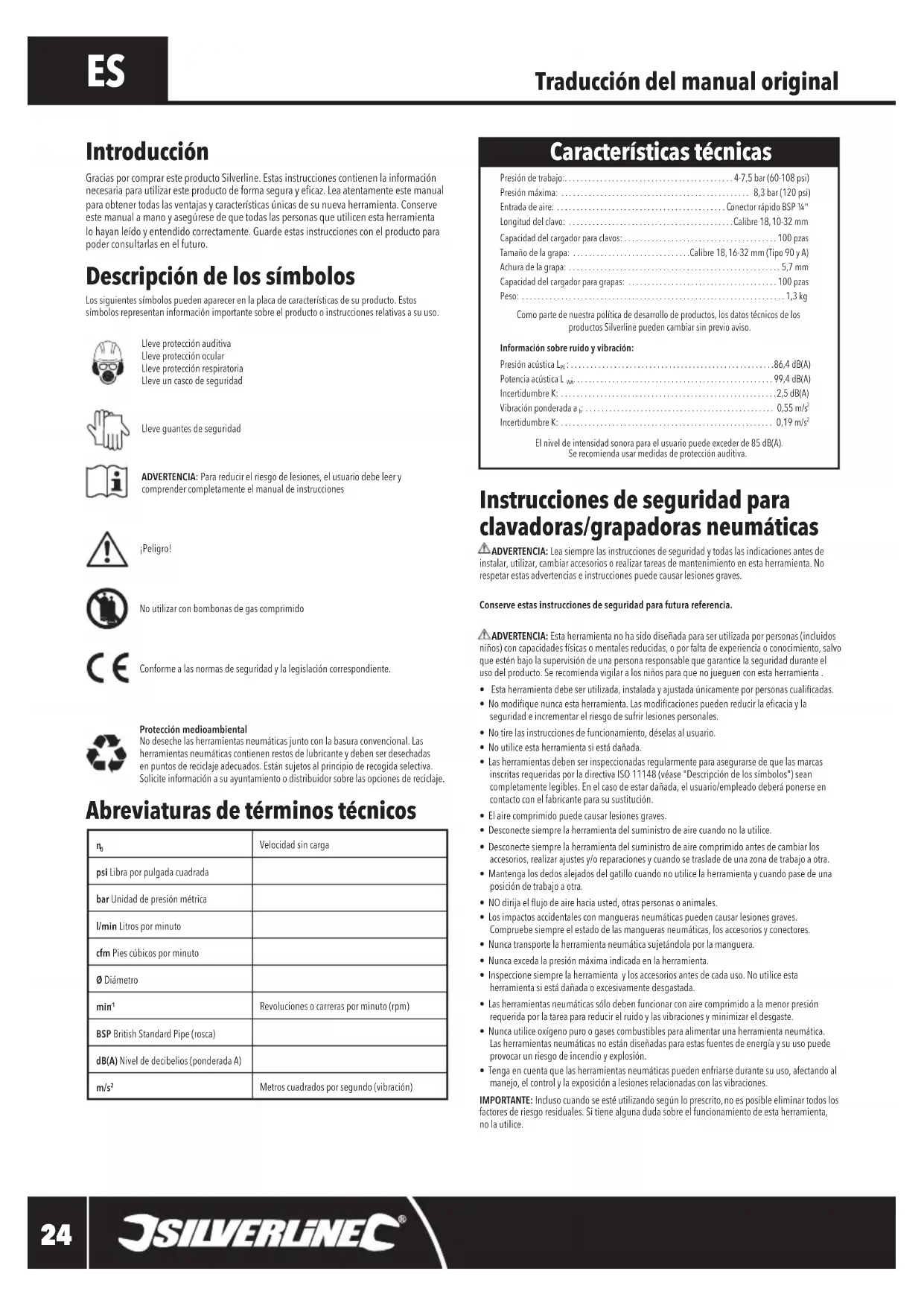 Presión de trabajo:...........................................4-7,5 bar (60-108 psi)Presión máxima: ................................................ 8,3 bar (120 psi) Entrada de aire: ...........................................Conector rápido BSP ¼" Longituddelclavo: ..........................................Calibre 18, 10-32 mm Capacidad del cargador para clavos: .......................................100 pzas Tamañodelagrapa: ..............................Calibre 18, 16-32 mm (Tipo 90 y A) Achura de la grapa: ......................................................5,7 mmCapacidad del cargador para grapas: ......................................100 pzasPeso: ...................................................................1,3 kgComo parte de nuestra política de desarrollo de productos, los datos técnicos de los productos Silverline pueden cambiar sin previo aviso.Información sobre ruido y vibración:PresiónacústicaL