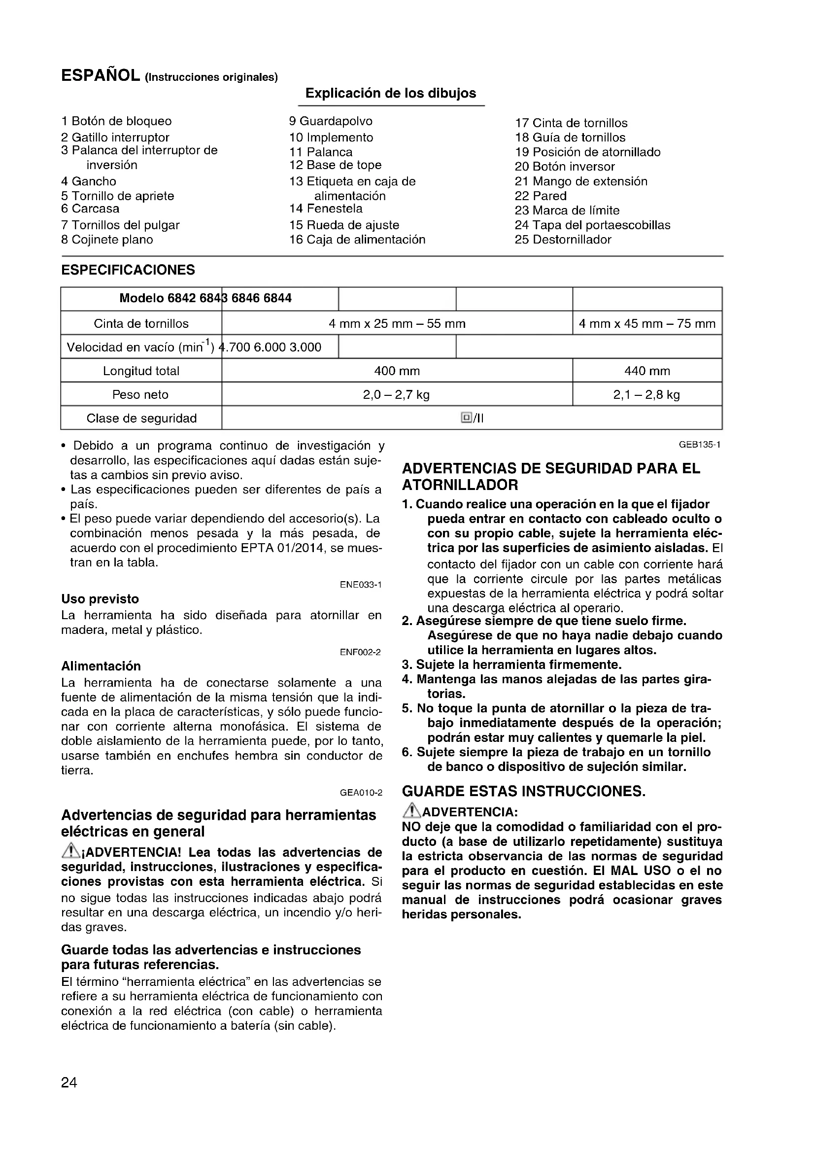 - El peso puede variar dependiendo del accesorio(s). La combinación menos pesada y la más pesada, de acuerdo con el procedimiento EPTA 01/2014, se mues- tran en la tabla. ENE033-1 Uso previsto La herramienta ha sido diseñada para atornillar en madera, metal y plástico. ENF002-2 Alimentación La herramienta ha de conectarse solamente a una fuente de alimentación de la misma tensión que la indi- cada en la placa de características, y sólo puede funcio- nar con corriente alterna monofásica. El sistema de doble aislamiento de la herramienta puede, por lo tanto, usarse también en enchufes hembra sin conductor de tierra. GEA010-2 Advertencias de seguridad para herramientas eléctricas en general ¡ADVERTENCIA! Lea todas las advertencias de seguridad, instrucciones, ilustraciones y especifica- ciones provistas con esta herramienta eléctrica. Si no sigue todas las instrucciones indicadas abajo podrá resultar en una descarga eléctrica, un incendio y/o heri- das graves. Guarde todas las advertencias e instrucciones para futuras referencias. El término “herramienta eléctrica” en las advertencias se refiere a su herramienta eléctrica de funcionamiento con conexión a la red eléctrica (con cable) o herramienta eléctrica de funcionamiento a batería (sin cable). GEB135-1